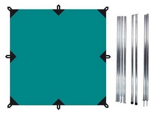 - + Лёгкий, прочный тент, с хорошей защитой от промокания, с качественными оттяжками. При наличии деревьев, можно использовать без стоек.