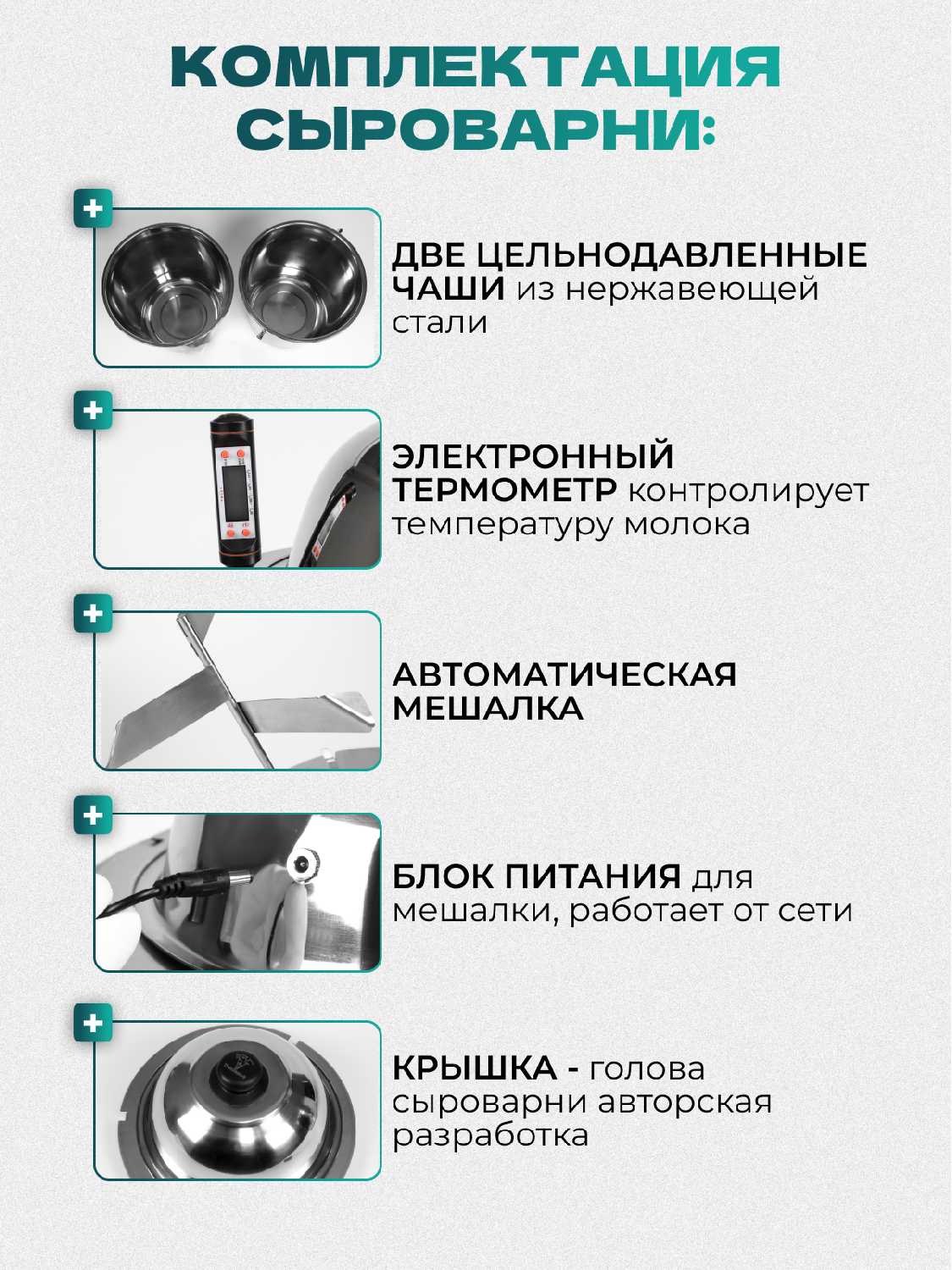 | Подробная комплектация : | Сыроварня, электронный термометр, блок питания, лопатка для помешивания, автоматическая мешалка |