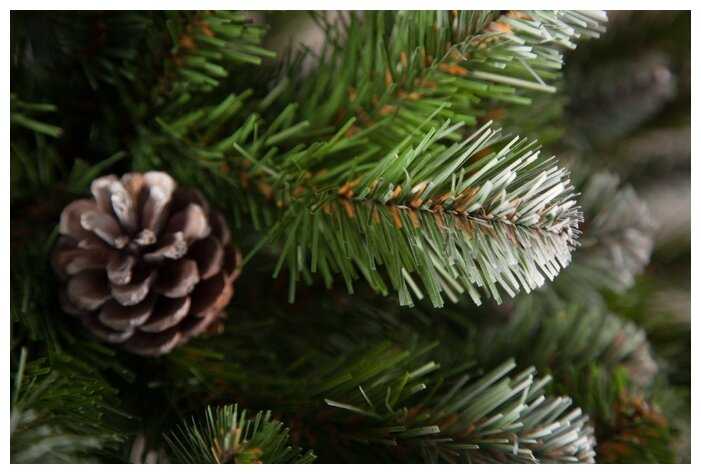 Очень красивая елка . Высокая , элегантно смотрится , не объёмная . Красивые ветки заснеженные, шишки натуральные . Легка в сборке . Давно о такой мечтала . Спасибо магазину , купила по очень выгодной цене.