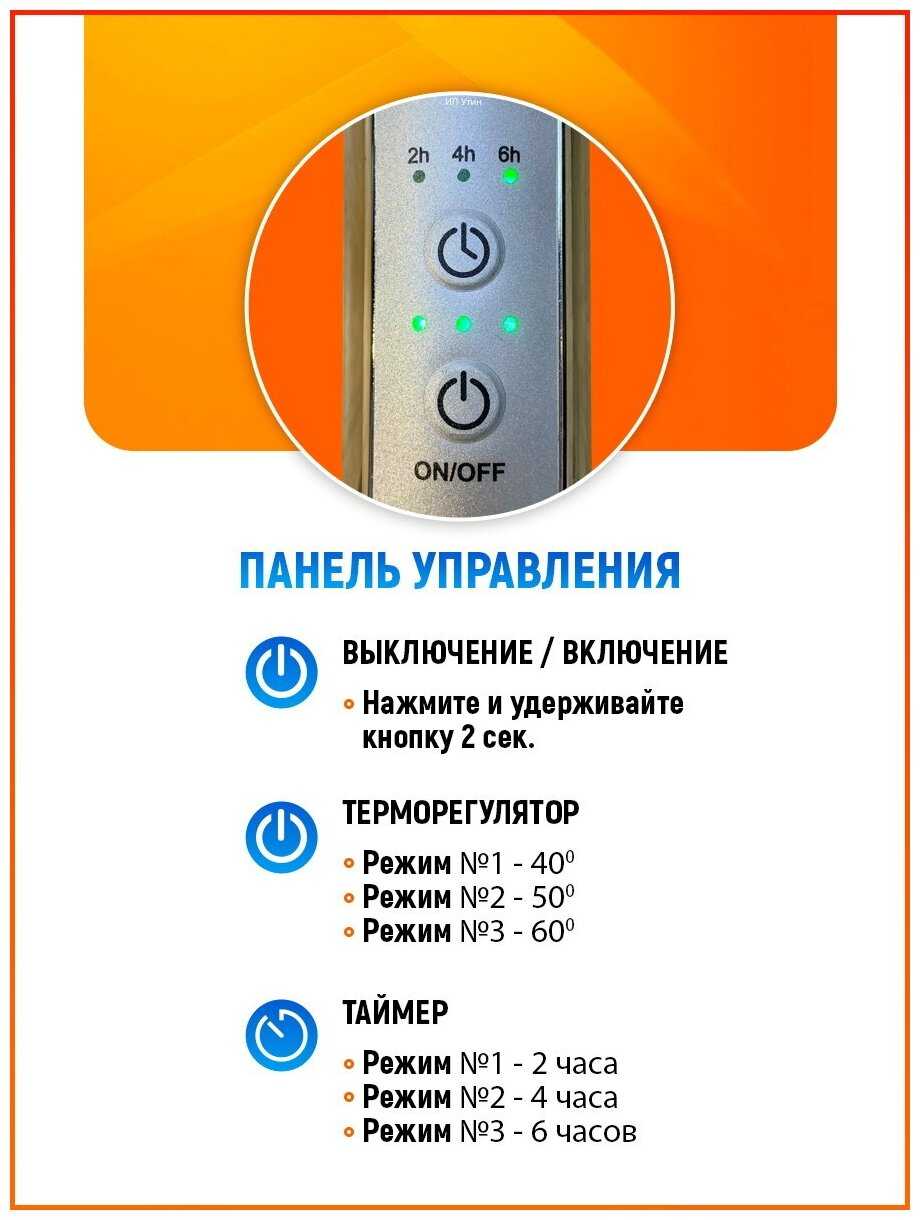 | Особенности : | кнопка включения/выключения, с таймером, терморегулятор |
