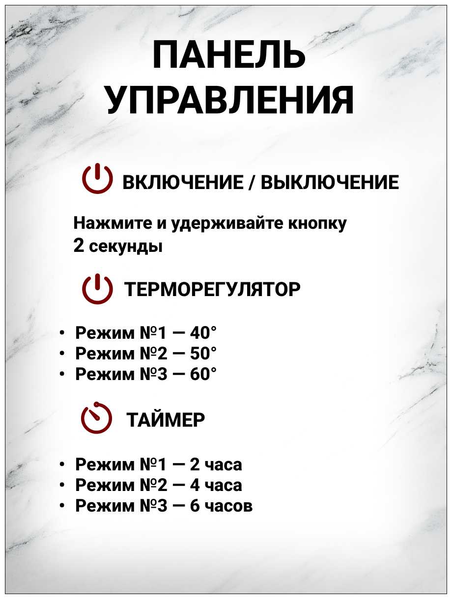 | Особенности : | кнопка включения/выключения, с таймером, терморегулятор |