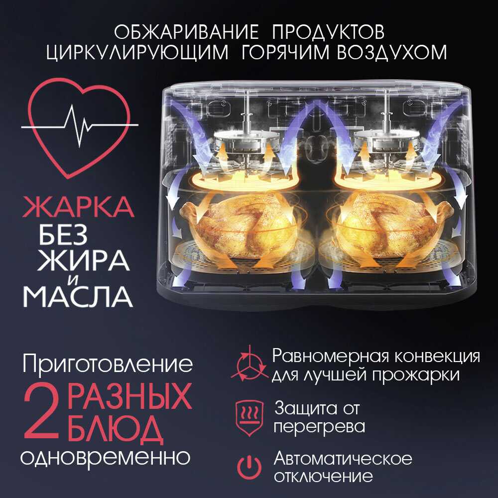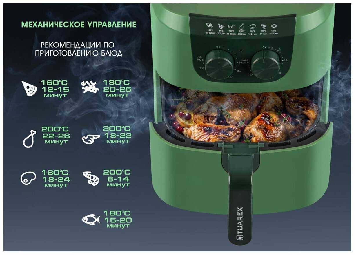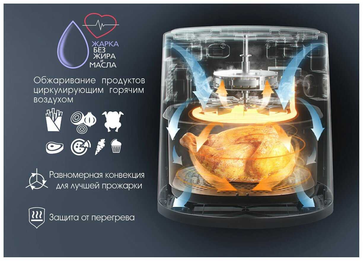 - Картофель фри, курица и овощи приобретают вкус, близкий к жареному, но без жира и брызг, что делает еду легче.