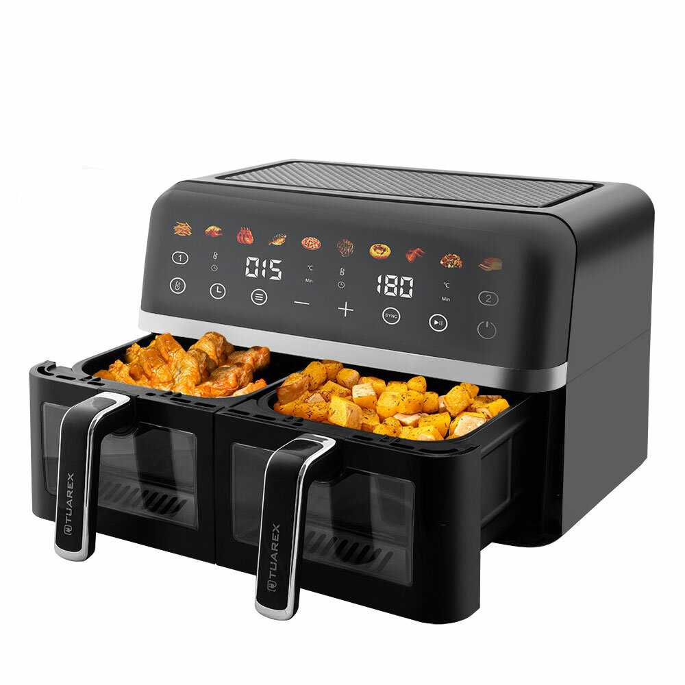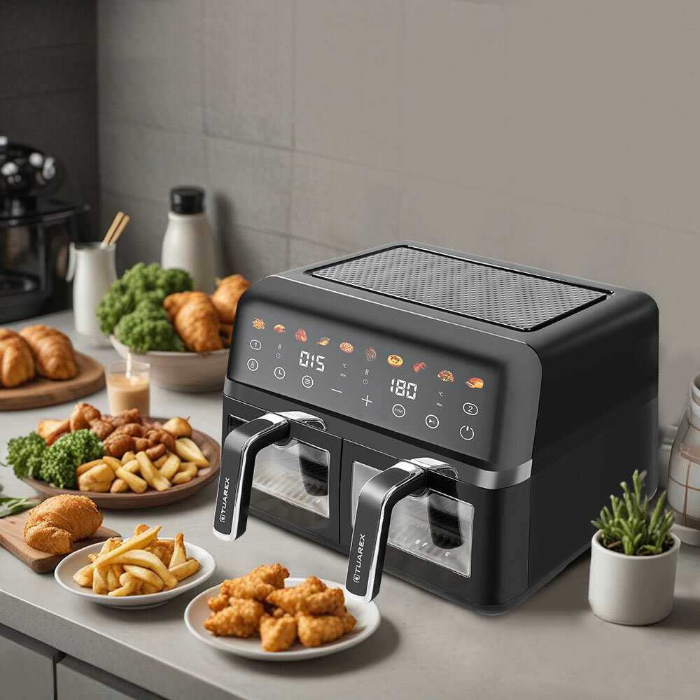 - Подходит для крылышек, фри, овощей или рыбы; для большой компании можно готовить в два приема.