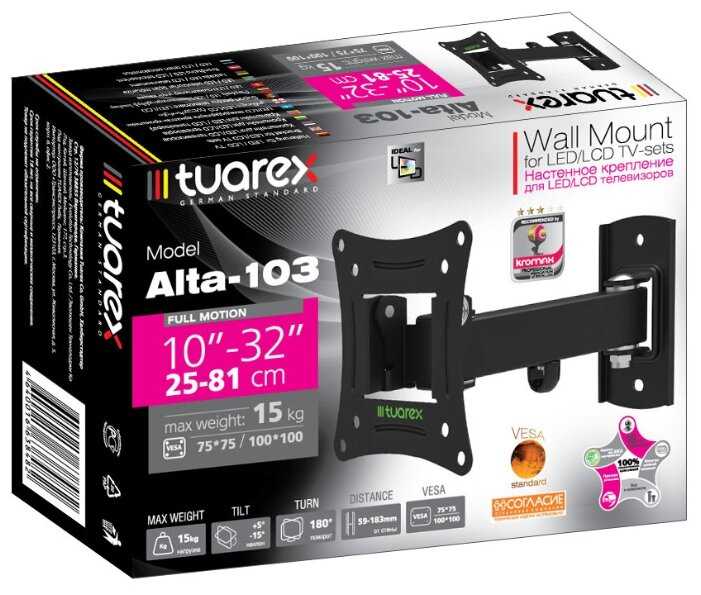 - Включает крепления под разные VESA (часто 100x100), дюбели для стены, ключи и уровень.