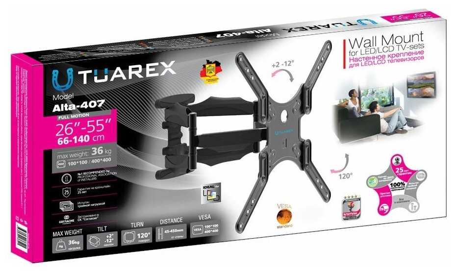 В целом, кронштейн на стену Tuarex Alta-407 представляет собой надежное и удобное решение для крепления телевизора, обеспечивая гибкость настройки и простоту установки.