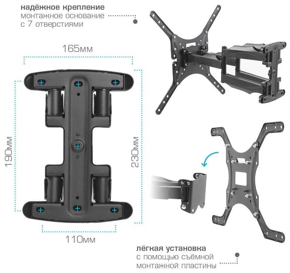 - + Нашим пожеланиям кронштейн соответствует, поворотно-наклонный, прочный и выдвижной.