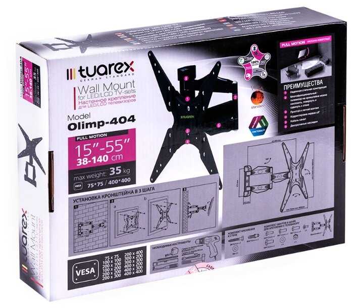 Надёжный, мощный, удобный. Телевизор 55"висит на нем 2года. Советую, в комплекте есть все что нужно.