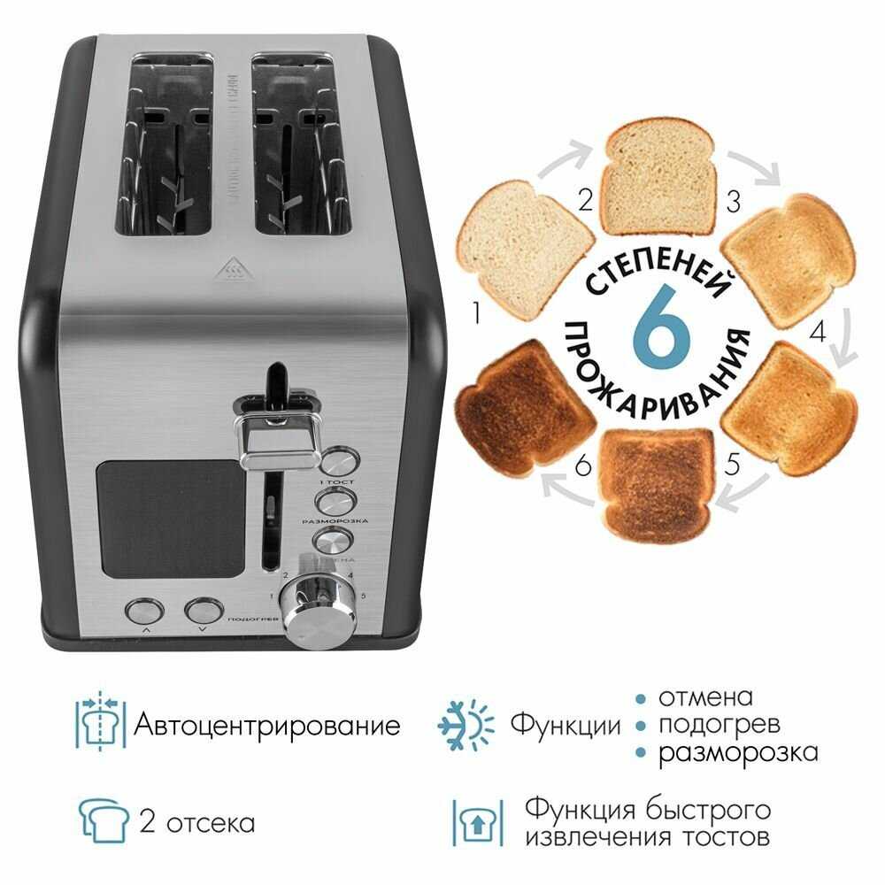 Подходит семьям с детьми для ежедневных завтраков благодаря простоте и широким слотам под булочки/бутерброды, а также тем, кто ищет стильный металлический тостер для современной кухни без лишнего пластика. Новички ценят интуитивность и дисплей, а любители разной прожарки - 6 режимов с таймером; не подойдёт тем, кто требует полной защиты от вылета тостов или длинный шнур без удлинителя.
