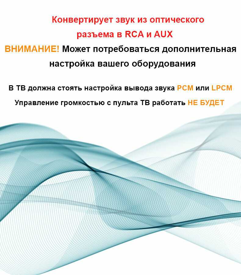 - + Компактность. Питание по USB. Наличие оптоволоконного кабеля в комплекте. Всё работает. Брал для подключения "ушей" к ТВ без AUX выхода. Единственный нюанс в моём случае (безотносительно данного девайса), если "уши" подключать к нему на прямую, то не будет возможности регулировать громкость, если на "ушах" нет регулятора. Но это решается переходником или "ушами" с регулятором. Это так, на заметку.