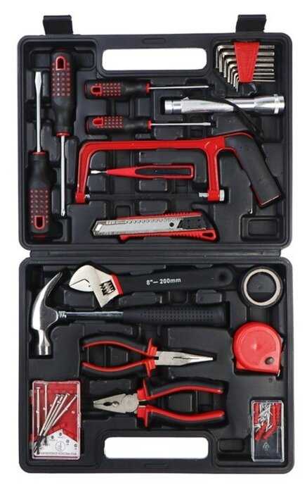Инструменты в комплекте : | длинногубцы, ключ разводной, ключи имбусовые (шестигранные), молоток, ножовка по металлу, отвёртки, отвёртки для точных работ, пассатижи, плоскогубцы |