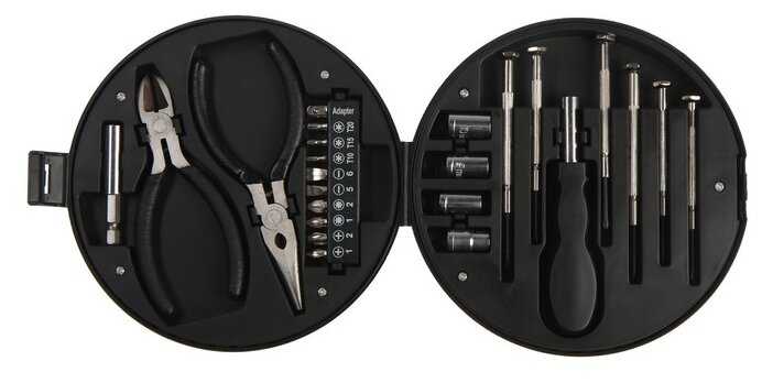 Инструменты в комплекте : | бокорезы, длинногубцы, отвёртки для точных работ, рукоять для бит |