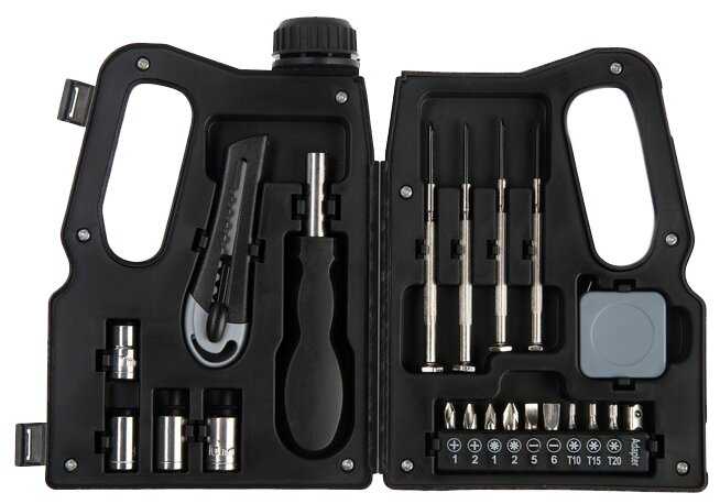 Инструменты в комплекте : | отвёртки для точных работ, рукоять для бит |