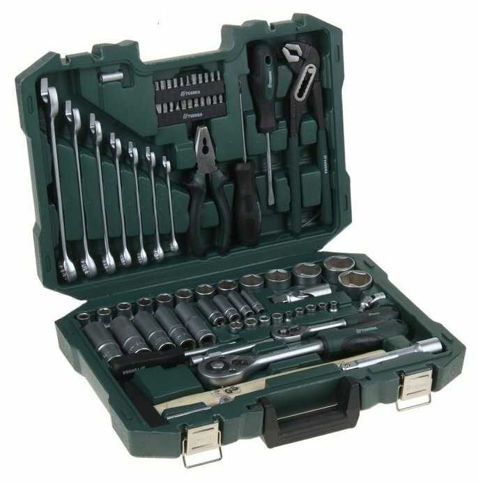 | Инструменты в комплекте : | вороток для головок, клещи, клещи переставные, ключи гаечные, молоток, отвёртки, пассатижи, плоскогубцы, трещотка |