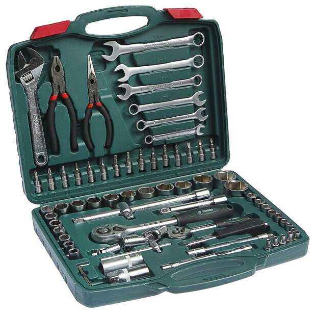 | Инструменты в комплекте : | вороток для головок, длинногубцы, ключ разводной, ключи гаечные, ключи имбусовые (шестигранные), отвёртки, пассатижи, плоскогубцы, трещотка |