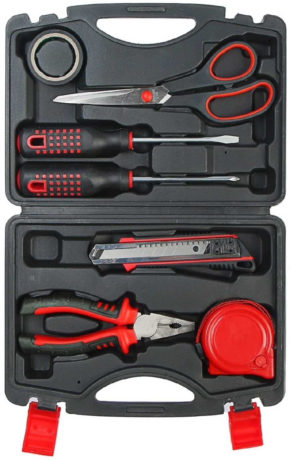 Ручной инструмент подробно : | пассатижи: 160 мм SL6 × 100 мм, универсальный нож: 18 мм, рулетка: 5 м × 19 мм, ножницы: 210 мм, изолента |