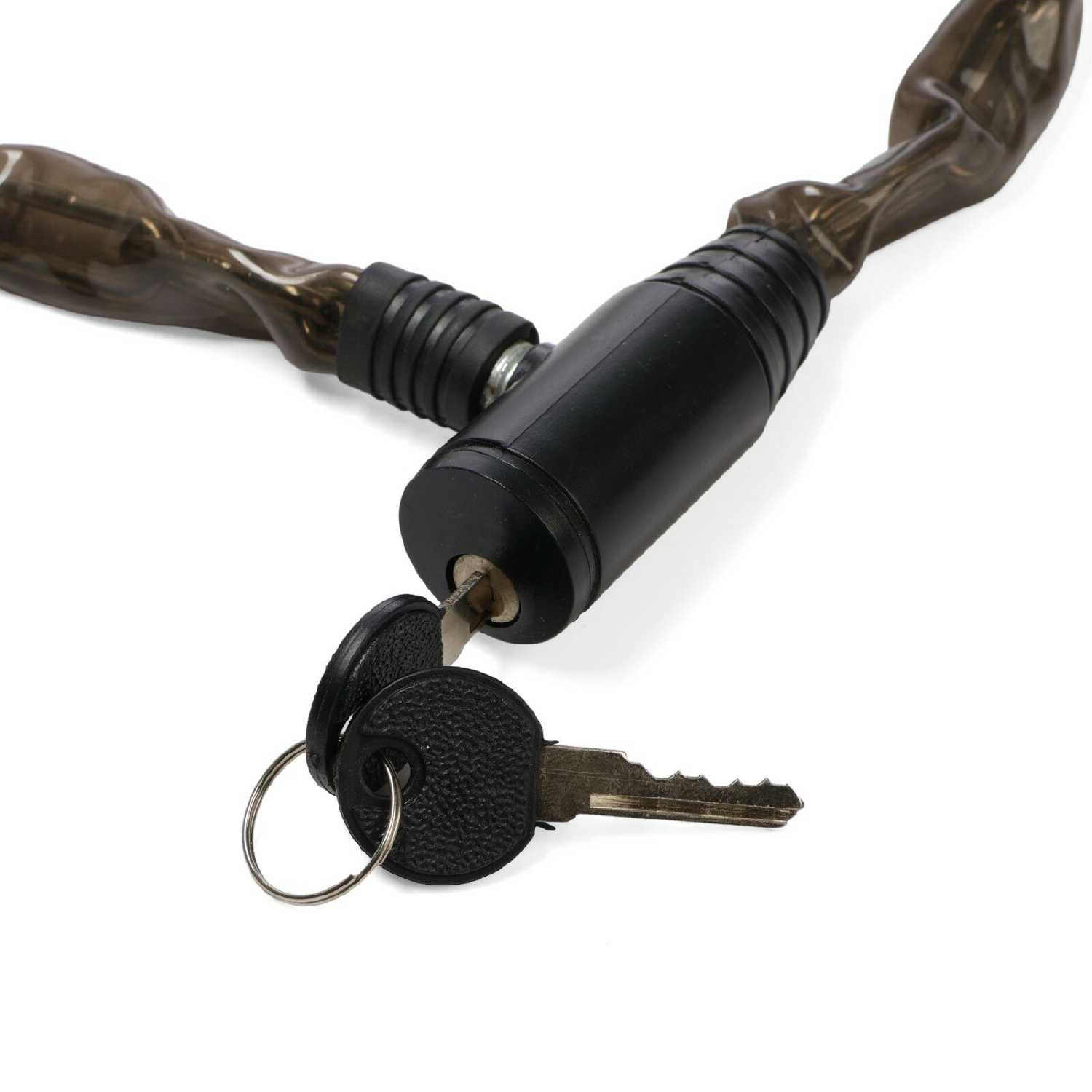 Очень мощный и тяжелый трос. Подойдет скорее для мотоцикла чем для велосипеда. Замок защелкивается при вложении в него ответной части с уже удаленным из него ключём. Выбирал имееео с цилиндрическим ключем, чтобы не было возможности вандалам засунуть в личинку посторонние предметы, изза которых невозможно будет вставить ключ.