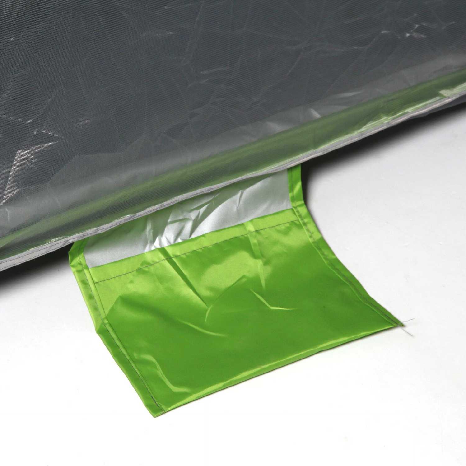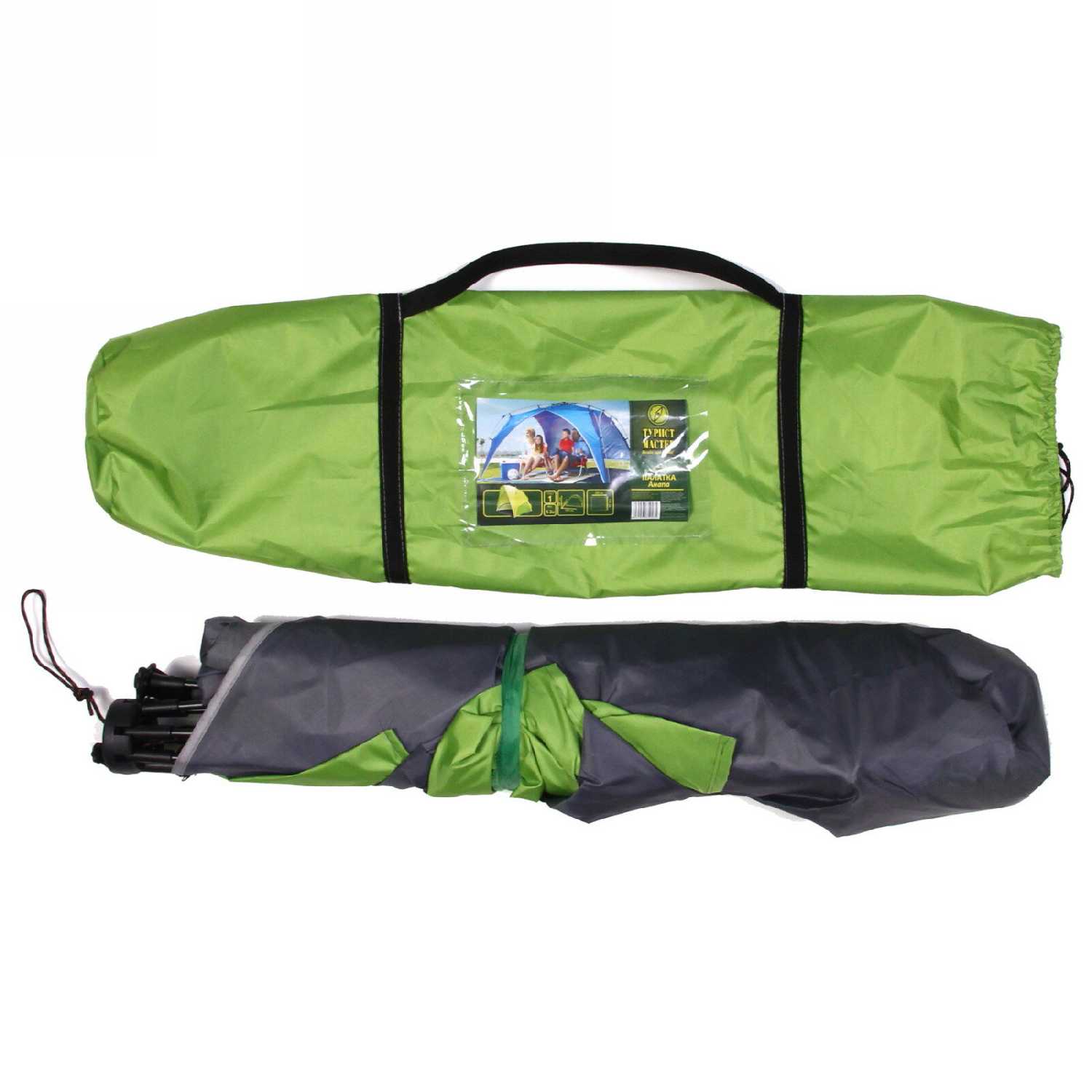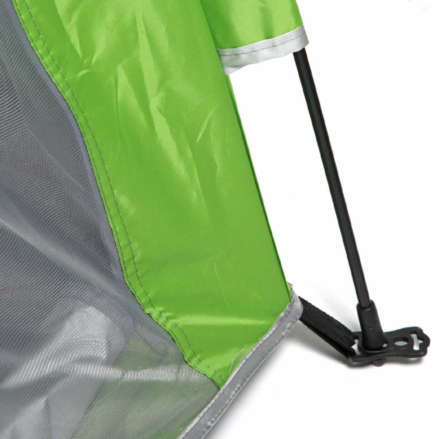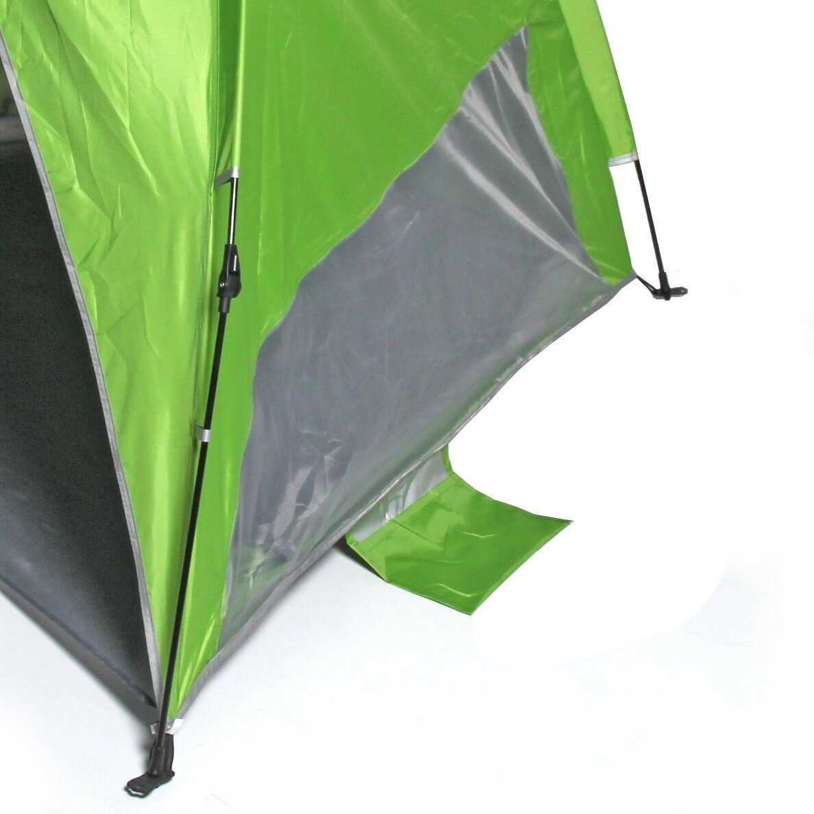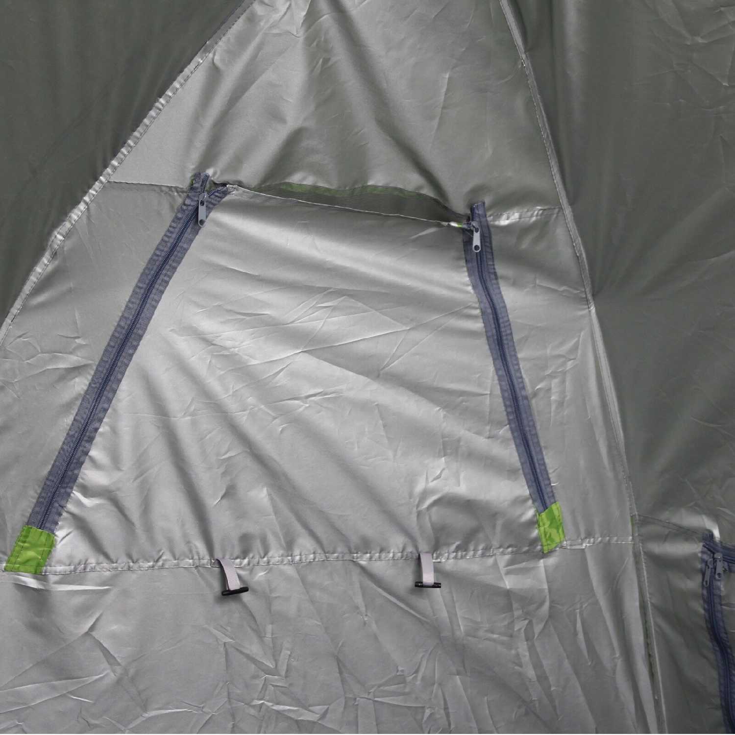 Дополнительная информация : | Палатка имеет прямоугольную форму и сложенную конструкцию, она зеленого цвета с серой подкладкой и черными молниями. |