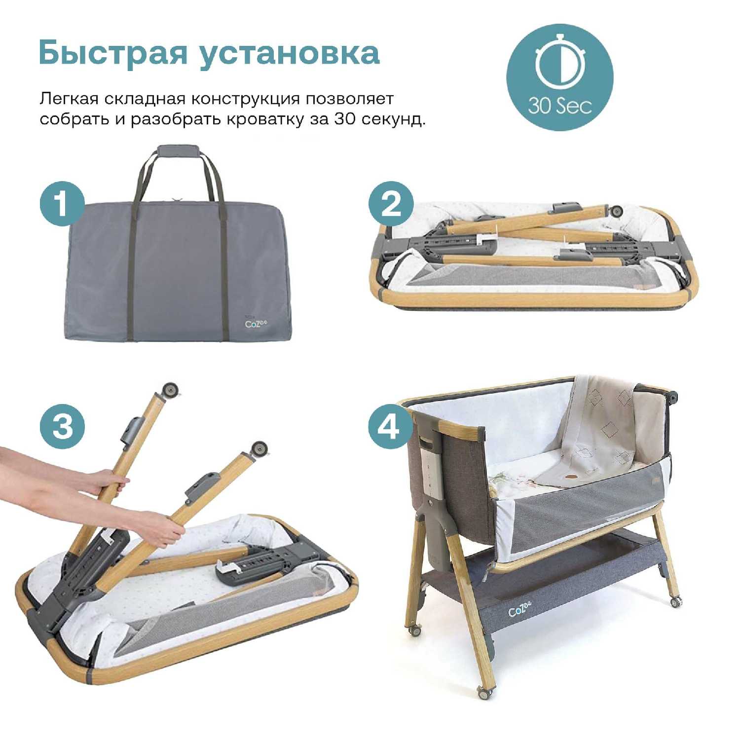 Колыбель собирается интуитивно за 3-5 минут без инструментов: все соединения на защелках, а этапы описаны в инструкции. Пользователи, включая беременных женщин, справляются самостоятельно. Разборка для транспортировки или хранения в чехле занимает аналогичное время, что подтверждается отзывами о поездках. -