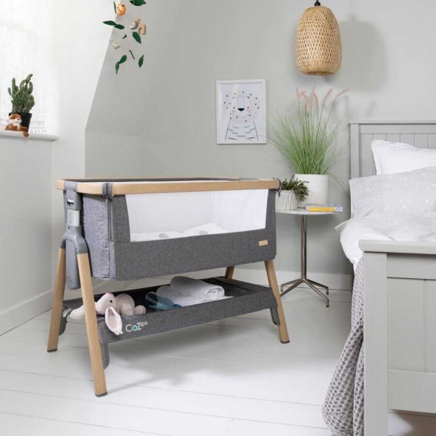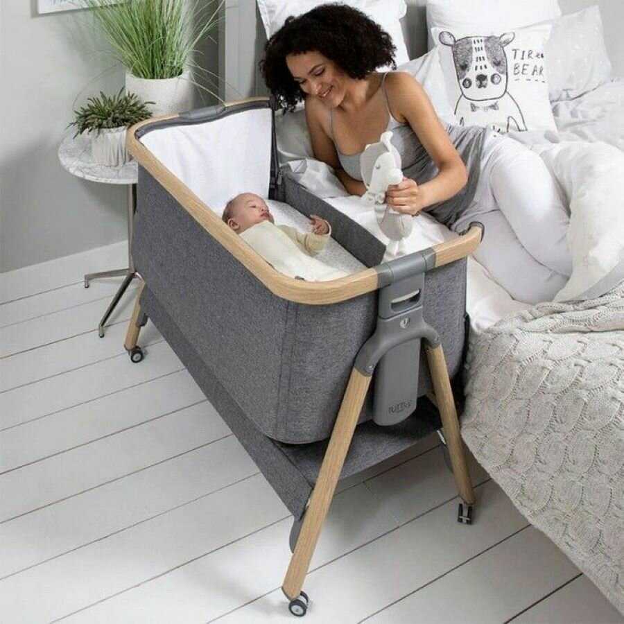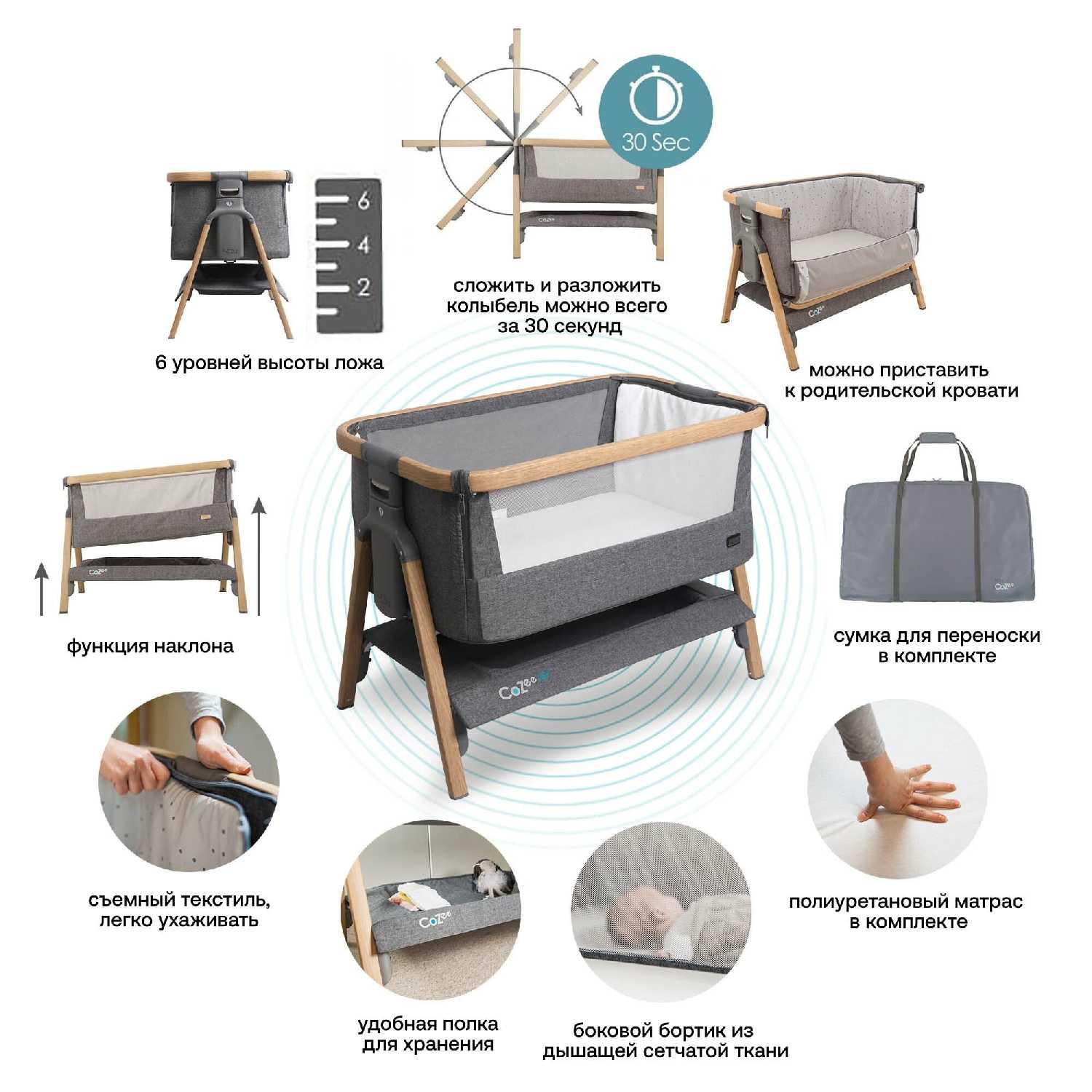 - + Красивая - современный стиль, компактная, приятная на ощупь, имеет регулировку высоты и наклона, имеет возможность поставить ее на колеса/качалку, есть «корзина» внизу и ремни для крепления к родительской кровати, легкая в сборке)