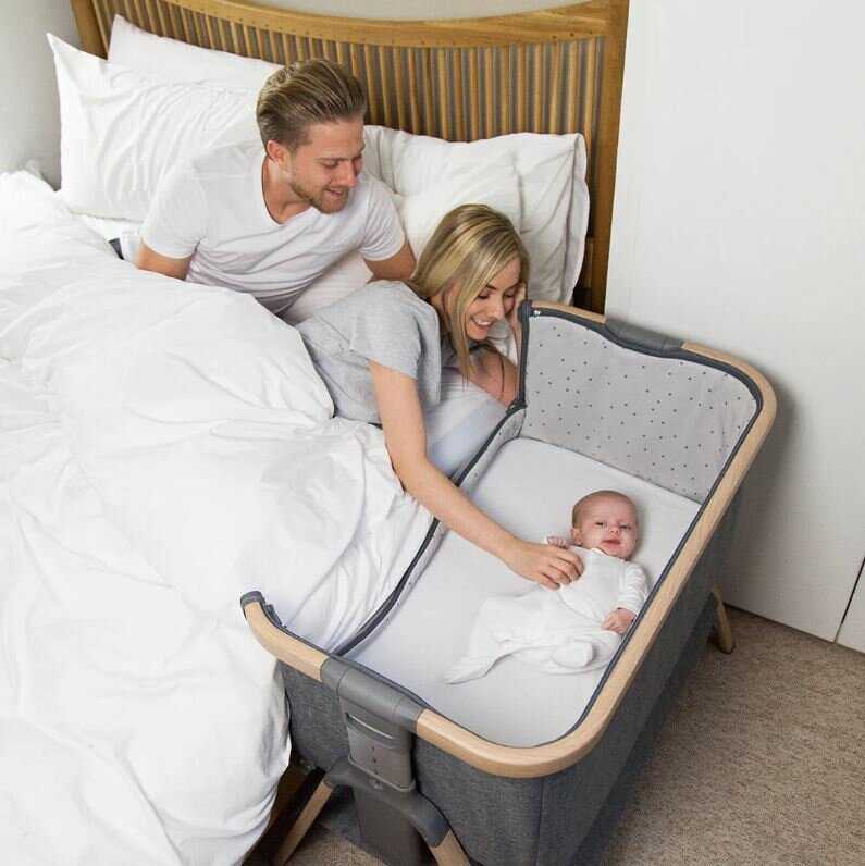 - Съемная передняя стенка позволяет приставлять кроватку вплотную к взрослой кровати для совместного сна.