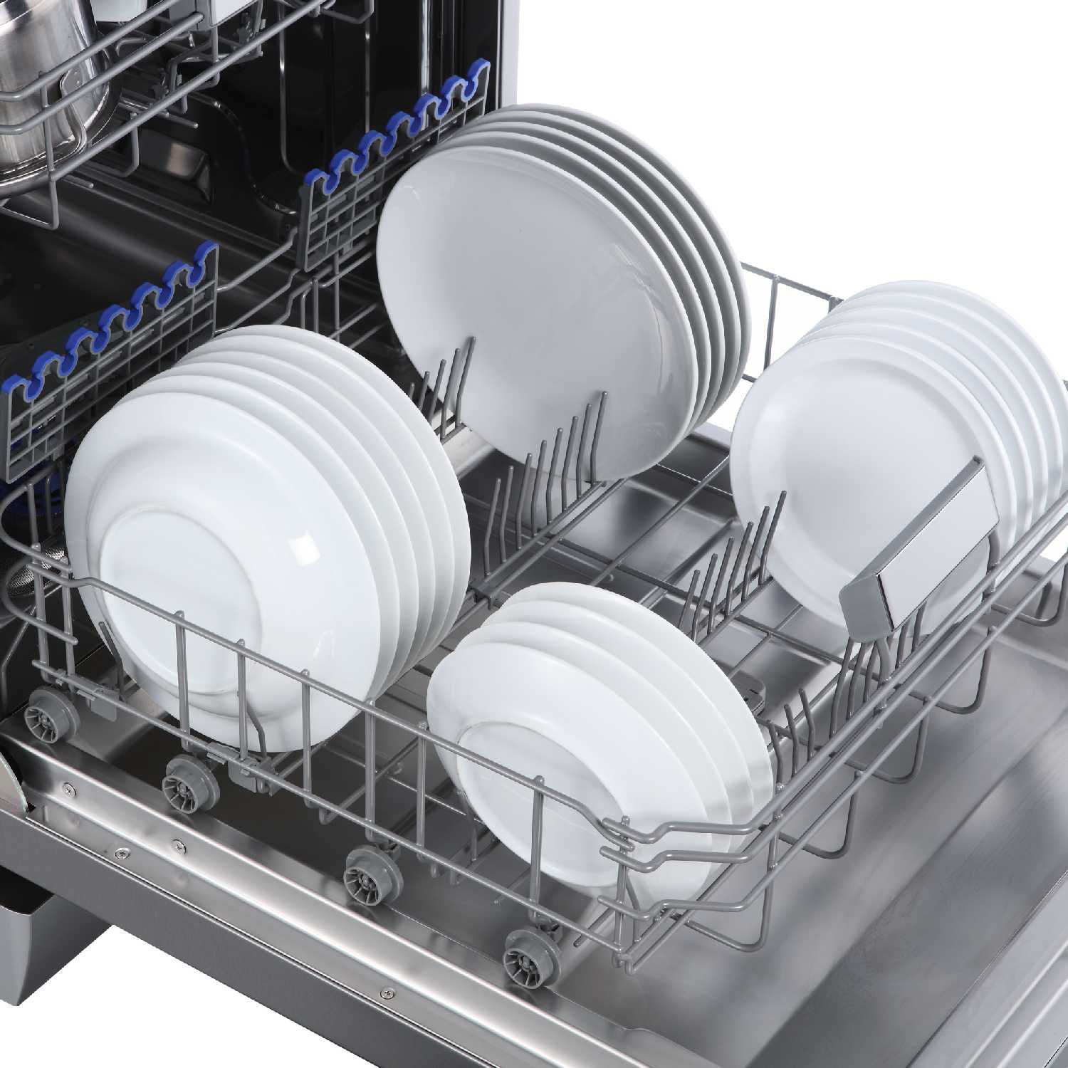 - Три корзины с регулируемыми разделителями позволяют размещать крупные кастрюли, сковороды и хрупкие бокалы.