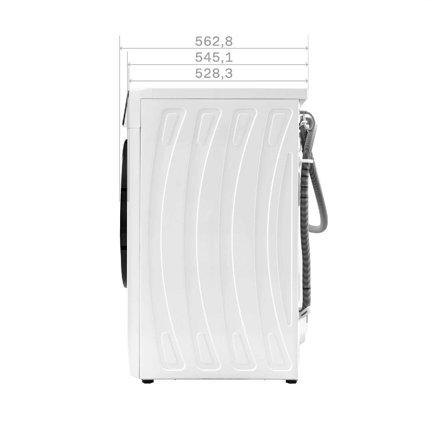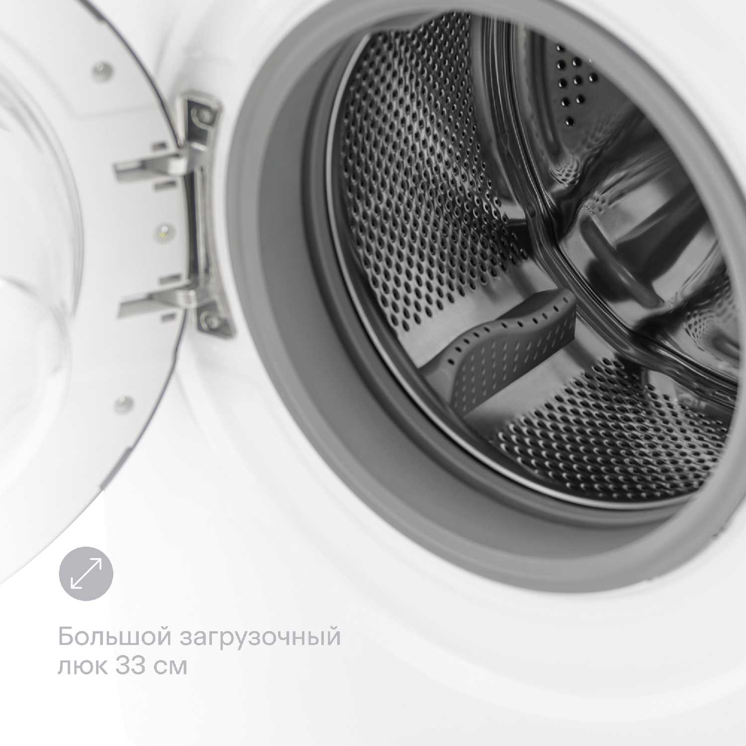 - Барабан 8 кг вмещает одеяла и крупные вещи благодаря диаметру люка 35 см.