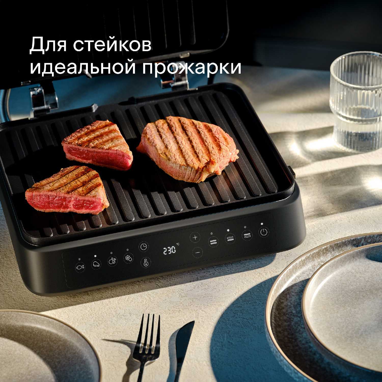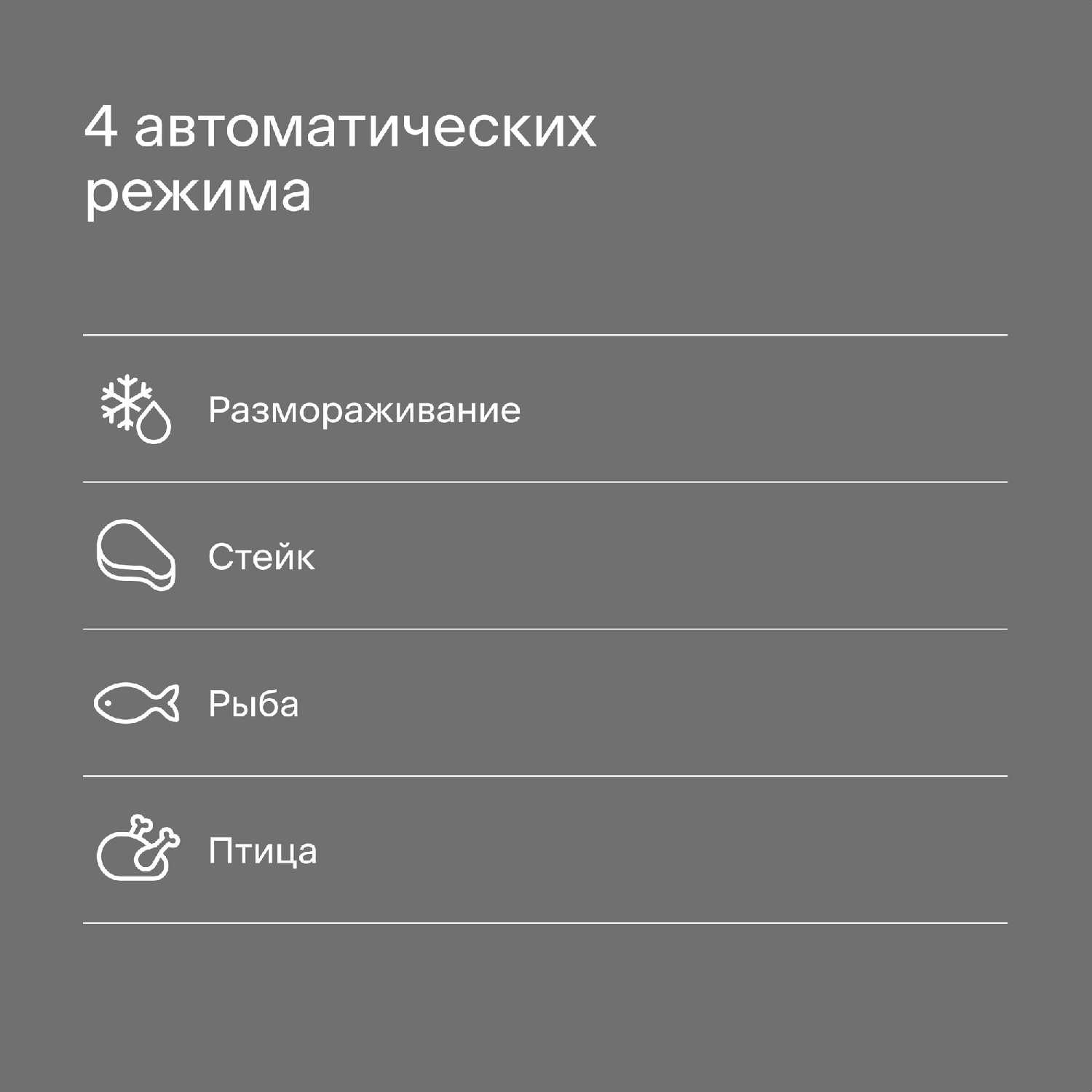 - 6 предустановок (стейк, овощи, вафли) оптимизируют процесс для новичков.