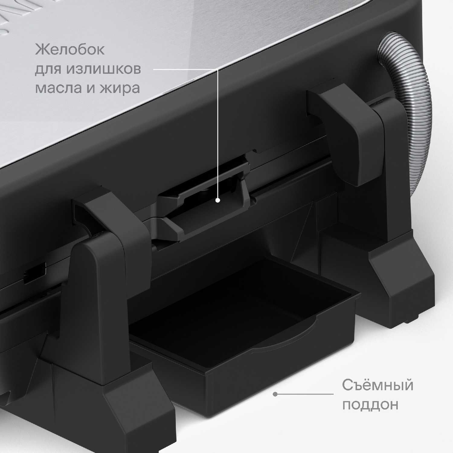 Контейнер вместительный, но конструктивно не оптимизирован: жир стекает медленно, оставаясь на рёбрах панелей. При переворачивании гриля возможны протечки масляно-водяной смеси через технологические отверстия. Для полного сбора жидкости рекомендуется наклонять корпус после приготовления. -
