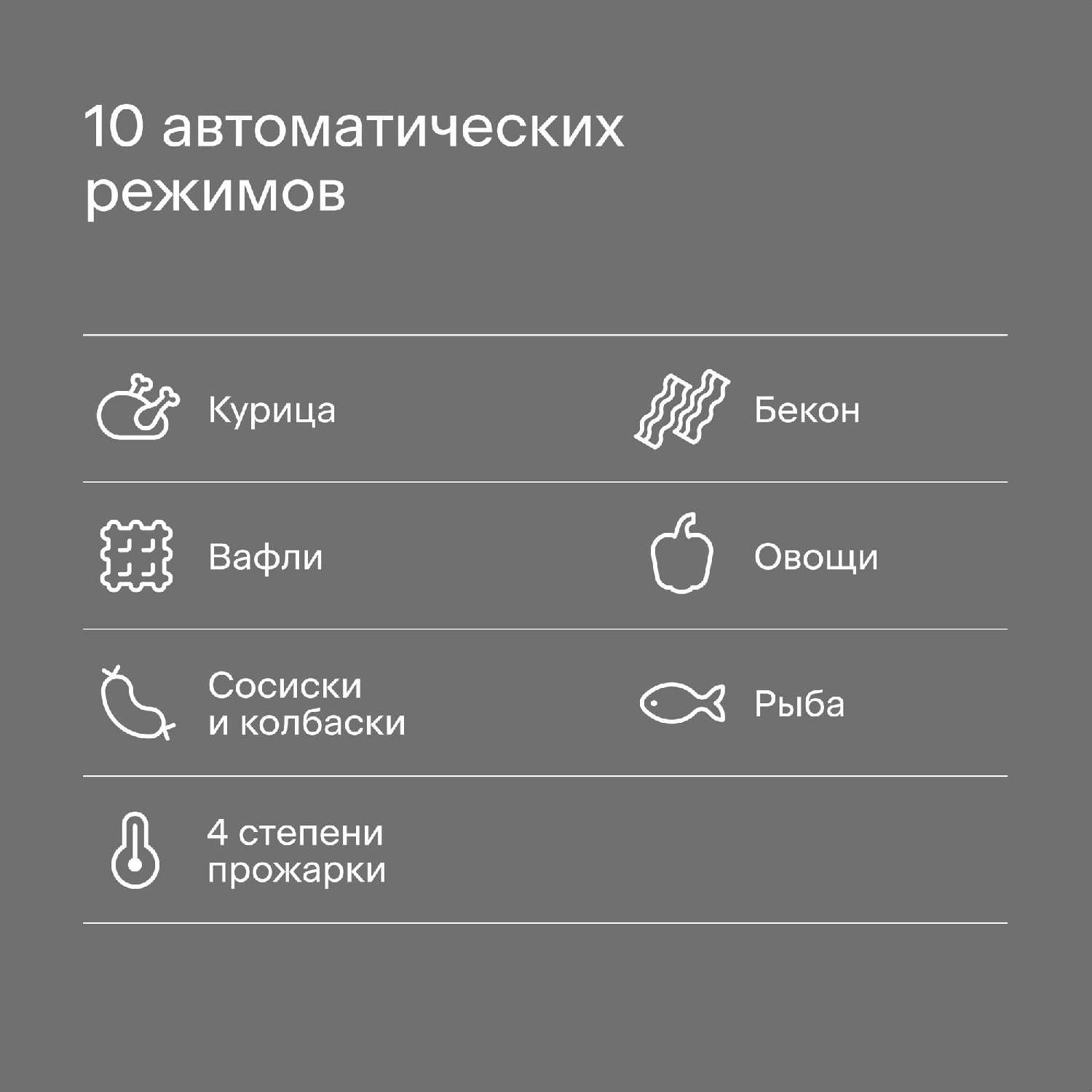 - + Готовит мясо, курицу, овощи, сосиски, вафли