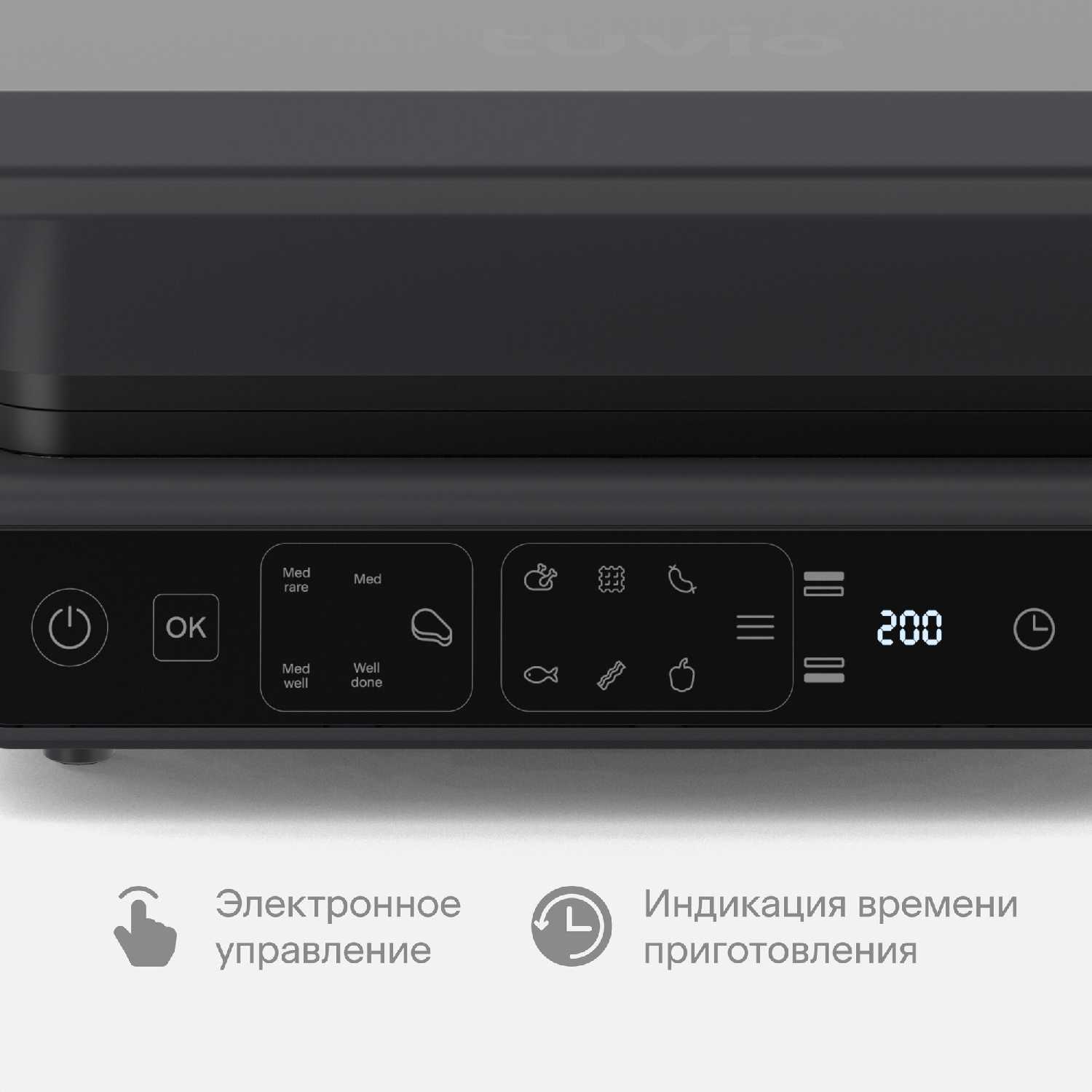 - возможность раскрыть гриль на 180 градусов и готовить на обеих панелях на разных температурах - - - Нельзя назвать это прямым недостатком, но панель управления не сенсорная, как может показаться на первый взгляд. на ней несколько физических кнопок, нажимая несколько раз на которые выбираешь нужный режим