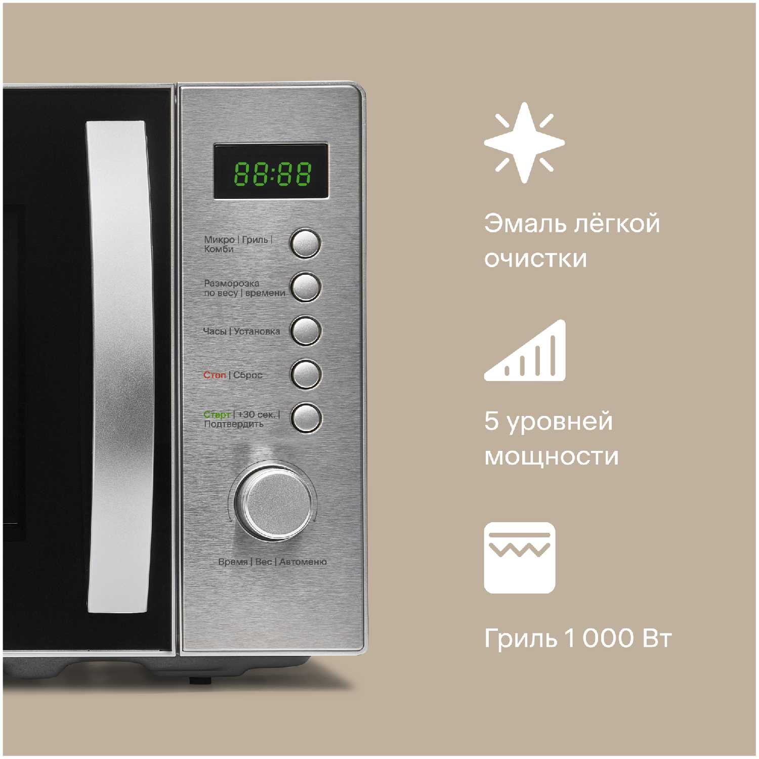 Компактные габариты (отмеченные в сравнении с 32-литровыми моделями) позволяют установить микроволновку даже в маленькой кухне, но ограничивают объем камеры — это важно при выборе посуды. Мощность разогрева достаточна для бытовых нужд, обеспечивая скорость работы. Технической особенностью является интуитивный интерфейс с колесиком для настройки времени, что ускоряет процесс. При этом вес устройства выше среднего, что может осложнить его переноску. -