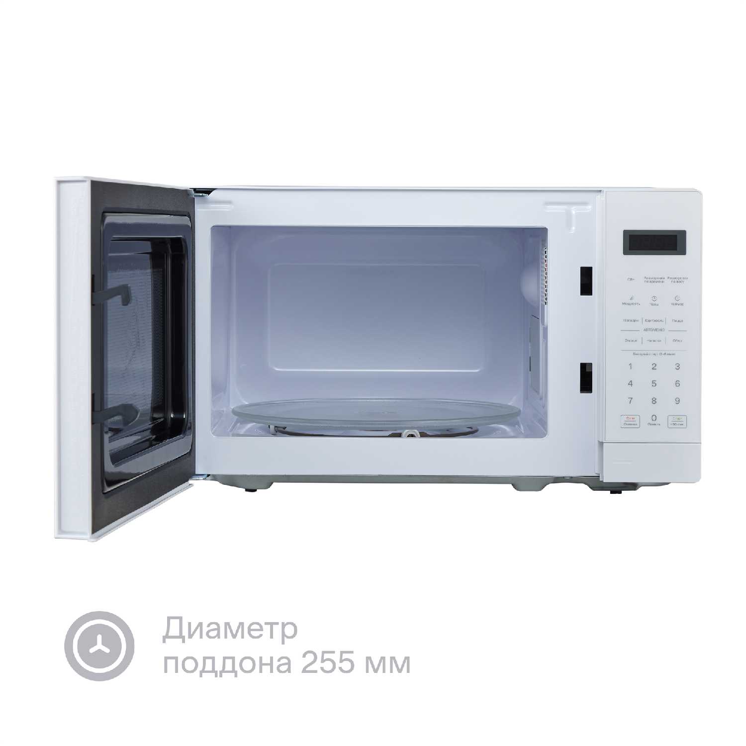 Отсутствие поворотного стола упрощает уход — нет необходимости мыть дополнительные детали. Внутренние стенки протираются влажной губкой без усилий. -