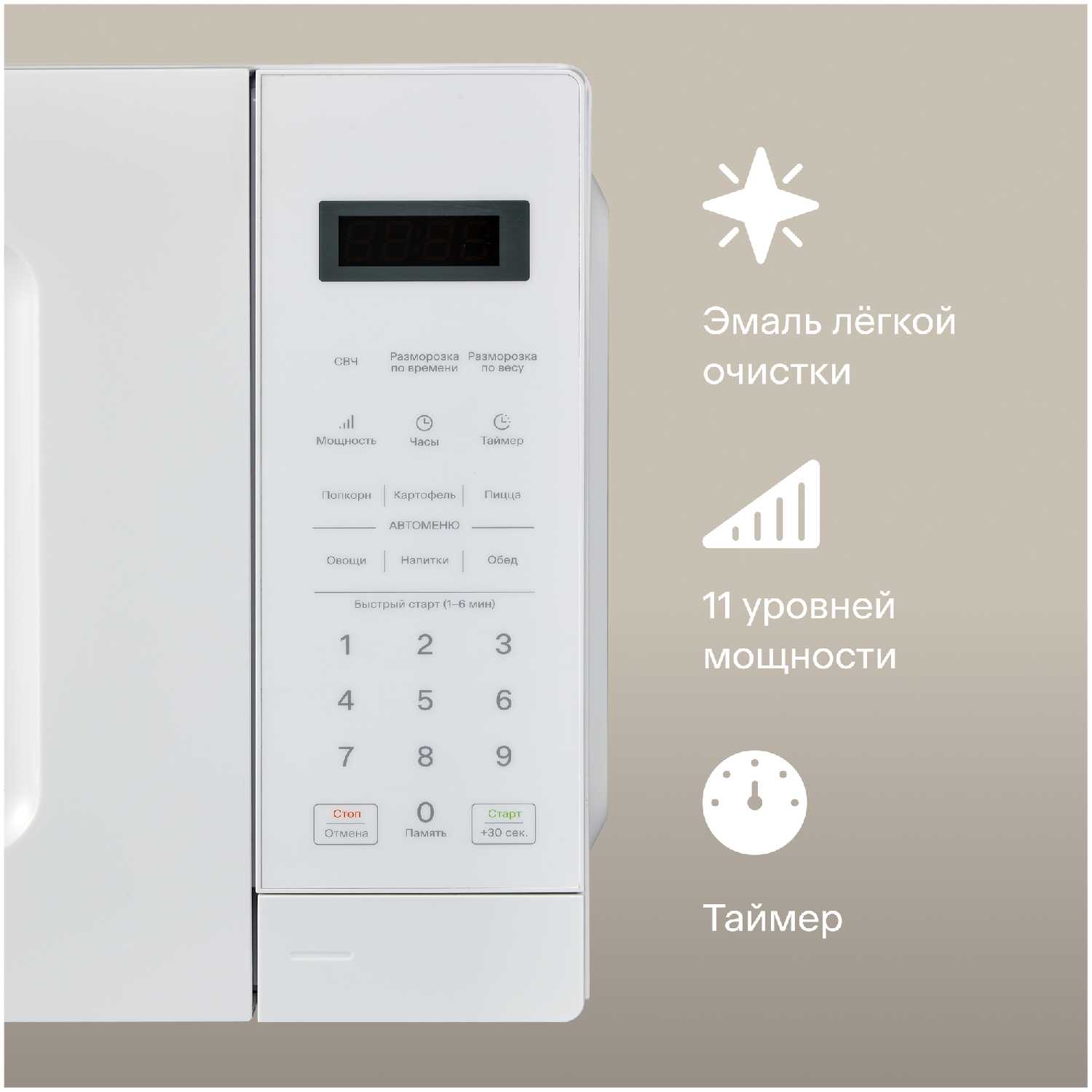 Есть кнопки для мгновенного старта на 30 секунд, 1, 2, 3, 4, 5 и 6 минут. Это упрощает разогрев без необходимости вручную устанавливать время. Для полуфабрикатов, например попкорна, предусмотрен отдельный автоматический режим. -
