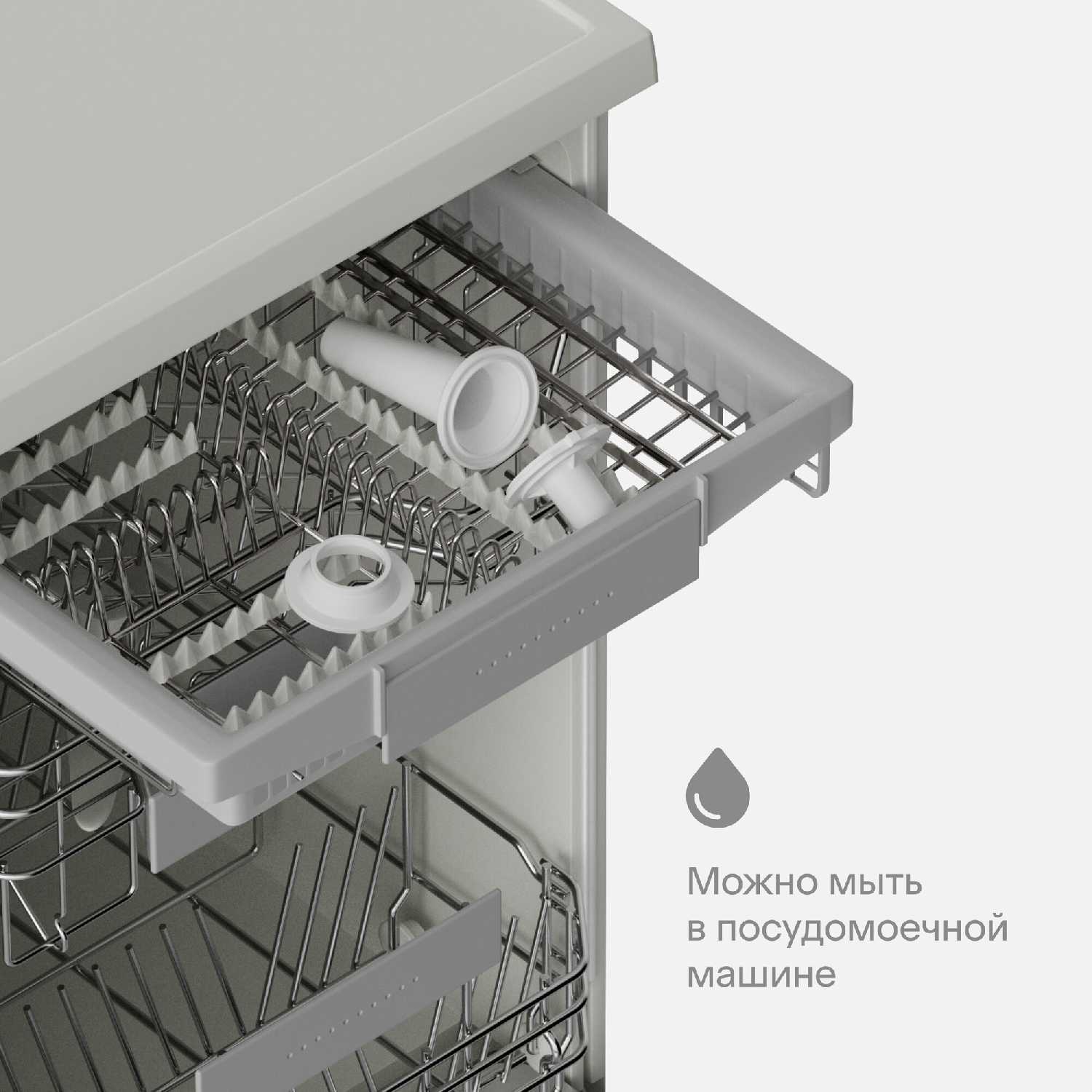 - Позволяет компактно размещать комплект, включая насадку для кубиков и колбасных шприцов.