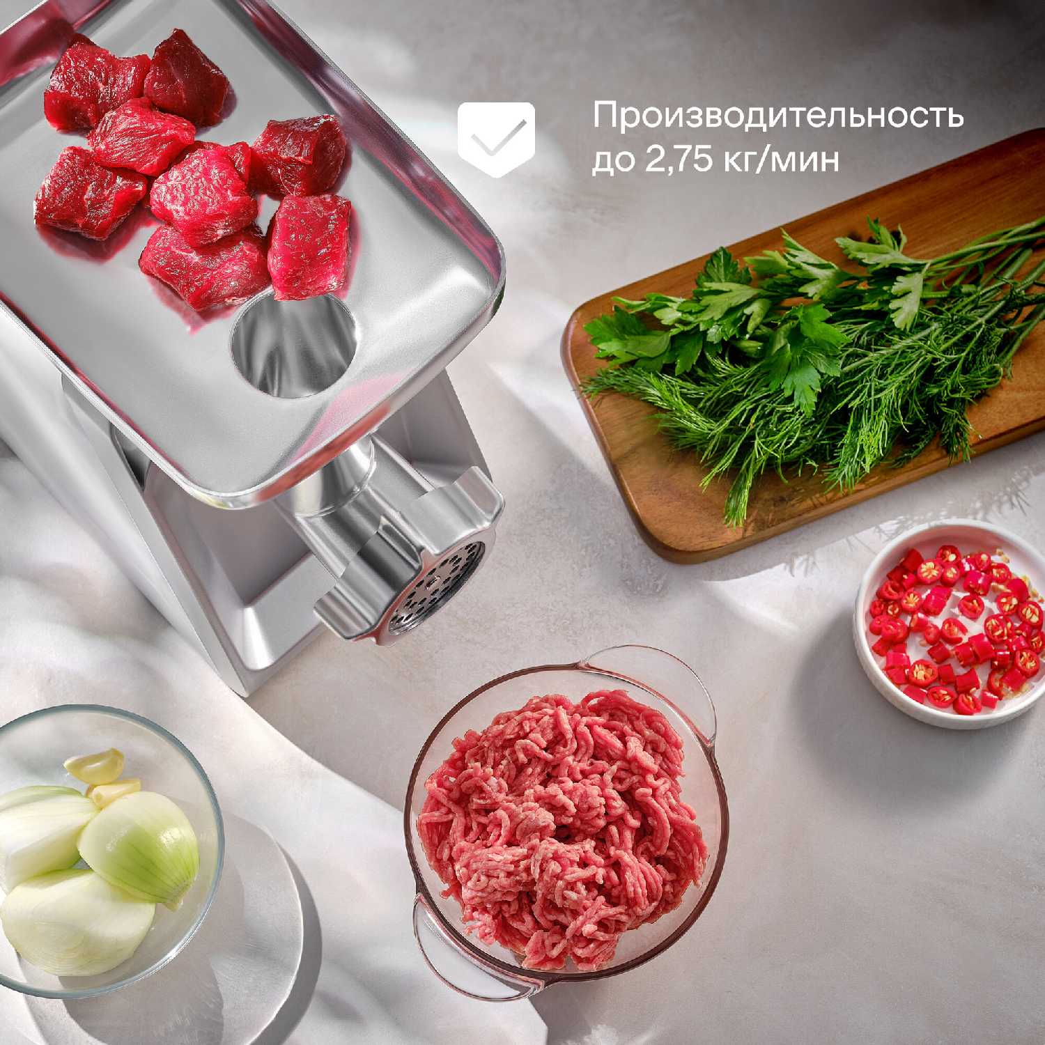 Модель демонстрирует высокую производительность: пользователи отмечают, что она легко перерабатывает до 7 кг свинины или говядины с прожилками за 10-15 минут. Электродвигатель эффективно справляется даже со слегка подмороженным мясом, не перегреваясь при непрерывной работе до 40 минут. Однако для костей или промышленных объемов она не предназначена. -