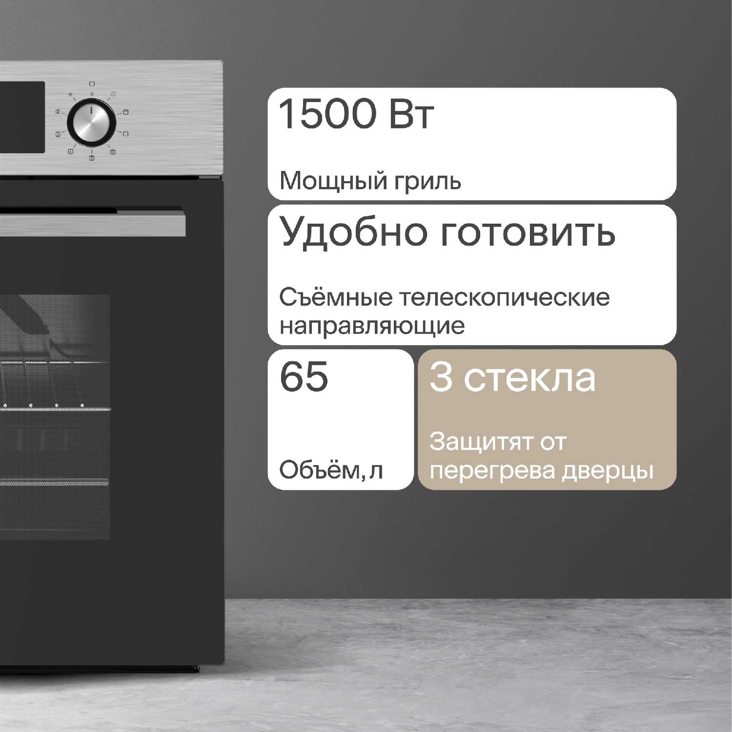 - Три слоя стекла значительно снижают температуру внешней поверхности дверцы, минимизируя риск ожогов при контакте, что критично для семей с детьми.