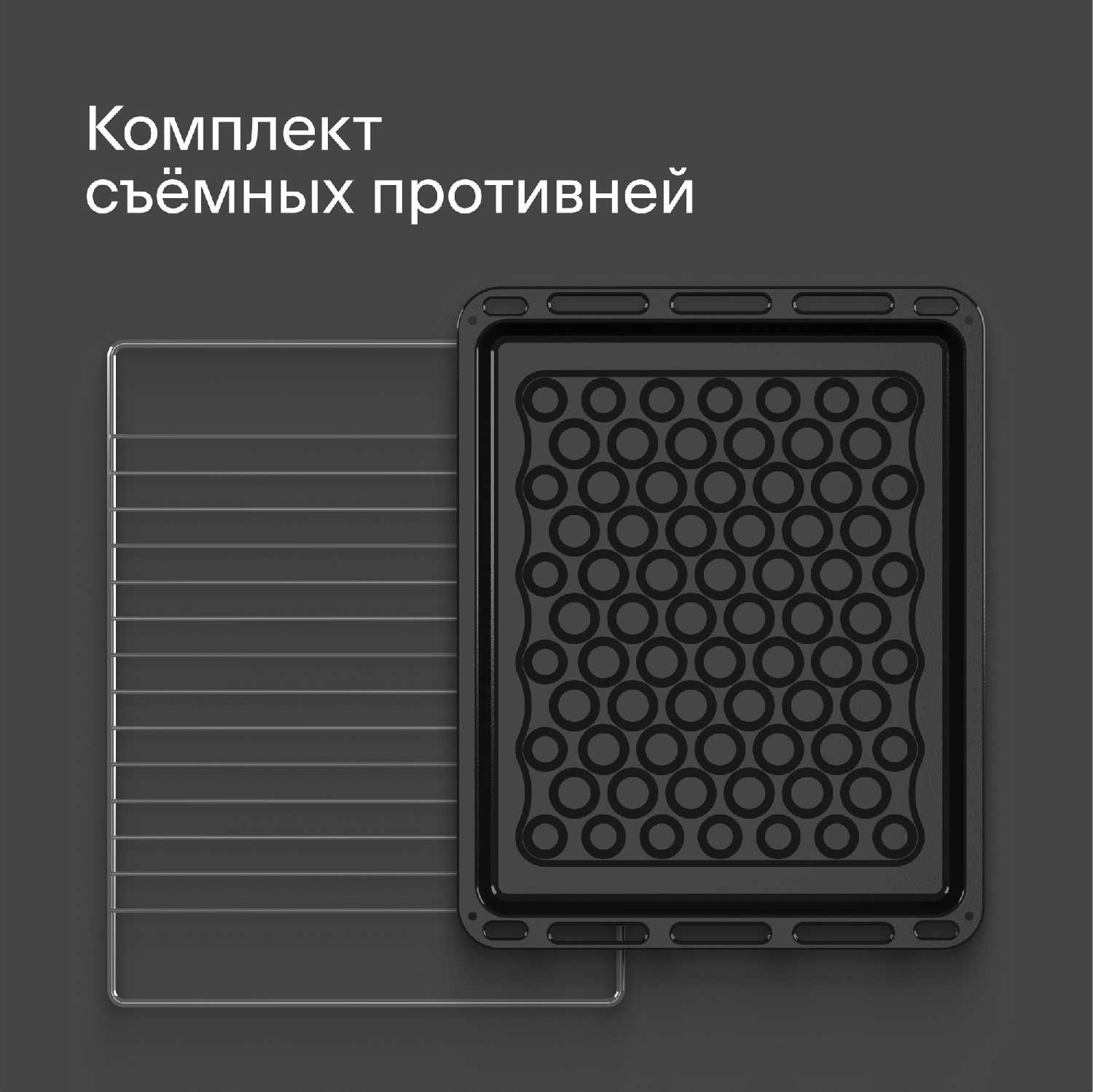 В стандартную комплектацию, судя по отзывам, входит один противень, что некоторые пользователи считают недостаточным. Решетки и телескопические направляющие присутствуют, но их надежность вызывает вопросы у части владельцев. Для комфортного использования многим приходится докупать дополнительные аксессуары, такие как более прочные решетки или противни. -
