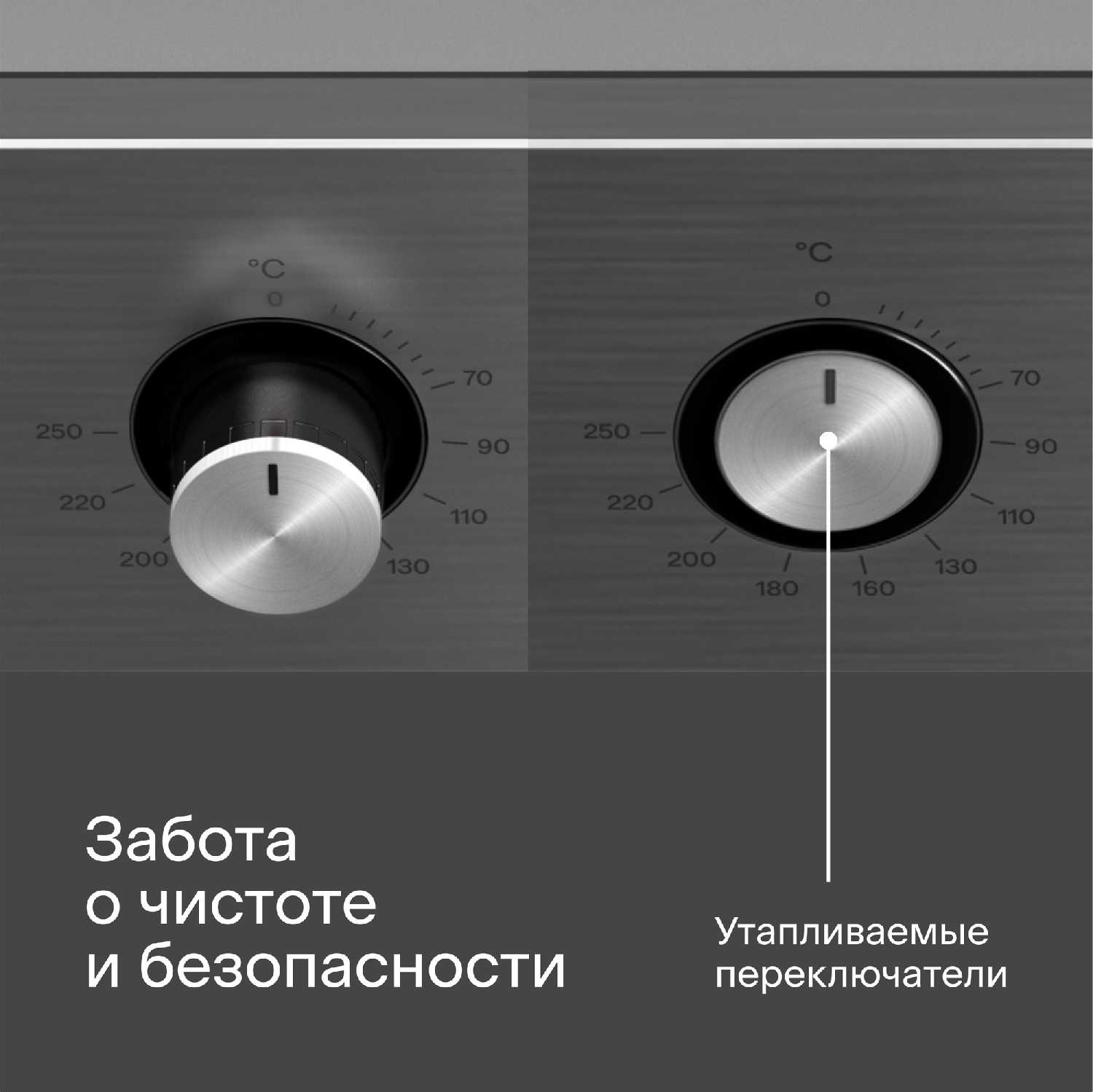 - В утопленном положении ручки не выступают за габариты духовки, что облегчает очистку лицевой панели и интеграцию в кухонный гарнитур.