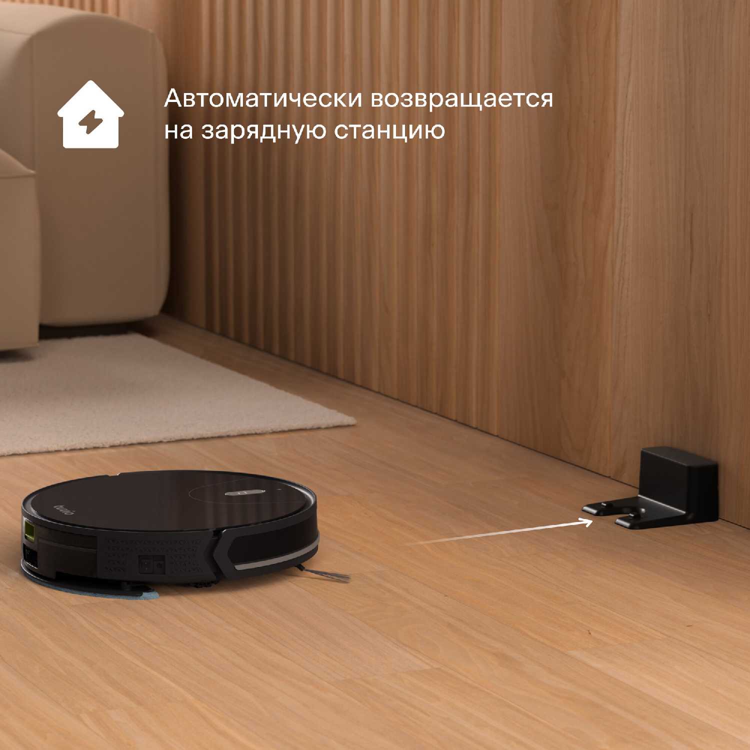 - Заряда хватает на уборку 30 м² за 27 минут, после чего пылесос автоматически возвращается на базу.