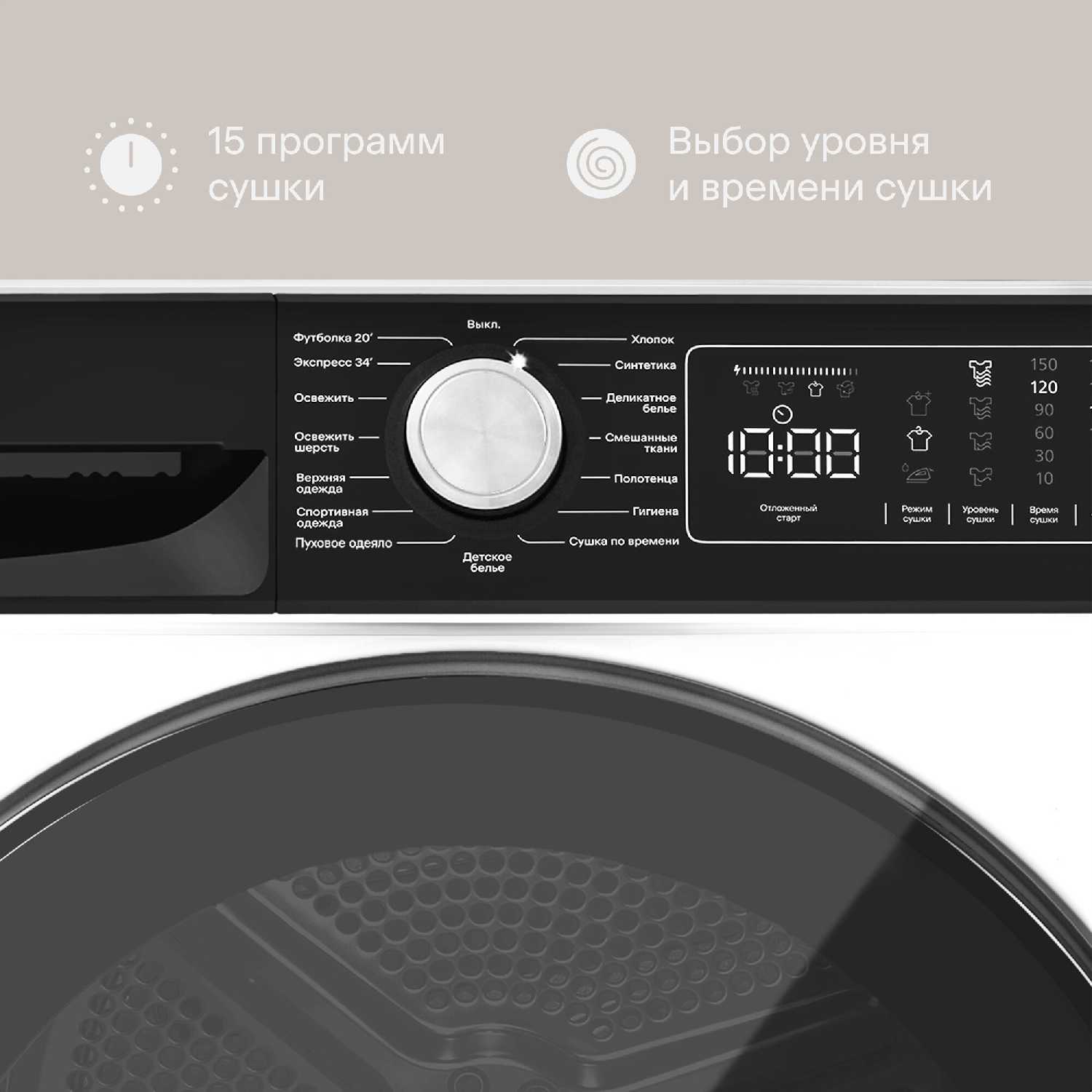 Барабан рассчитан на 10 кг белья, что позволяет сушить объемные вещи: одеяла, подушки, несколько комплектов постельного белья за один цикл. Пользователи подчеркивают, что машина заменяет напольные сушилки, экономя пространство. -