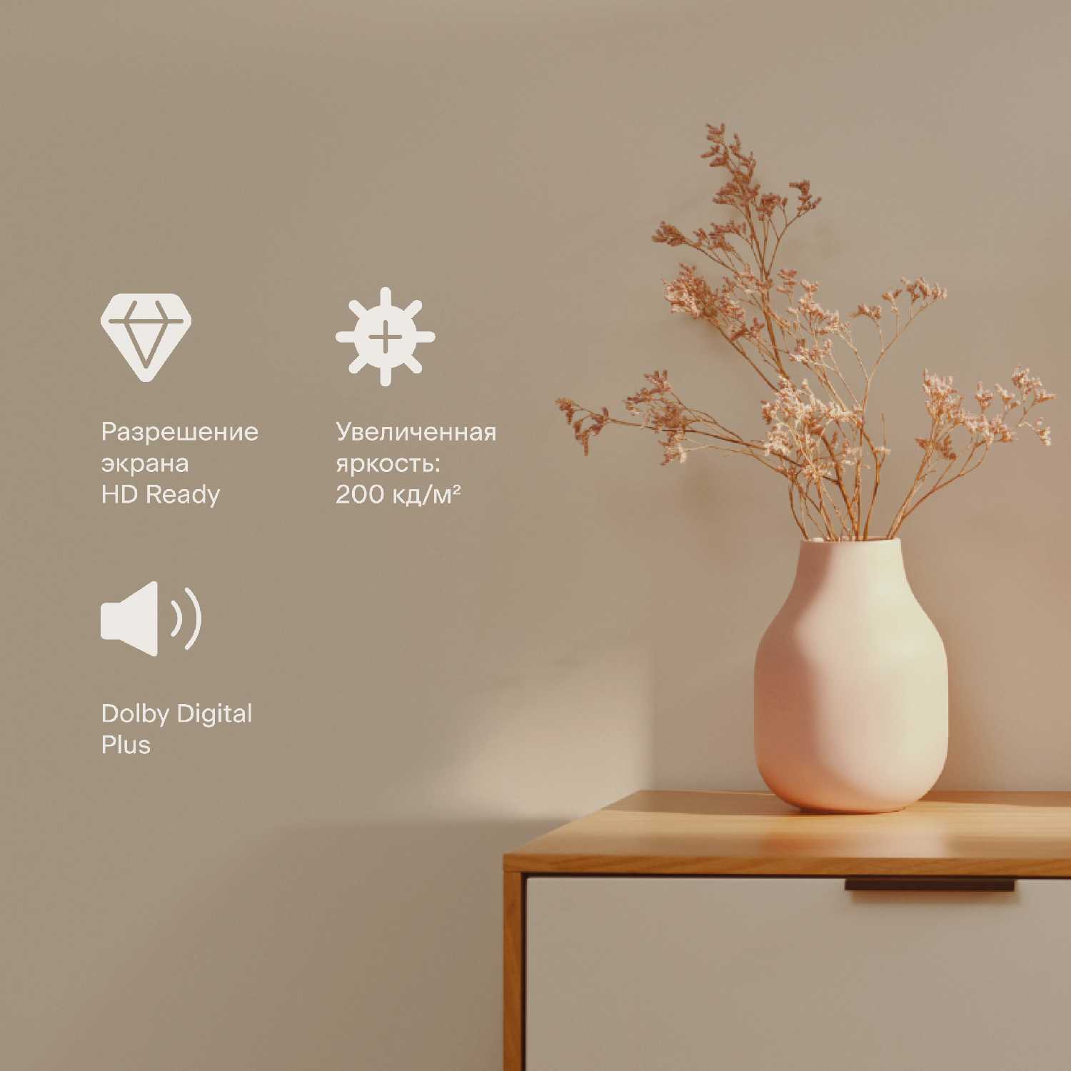- LED-экран с разрешением HD обеспечивает яркость до 220 кд/м², что достаточно для помещений с естественным освещением.