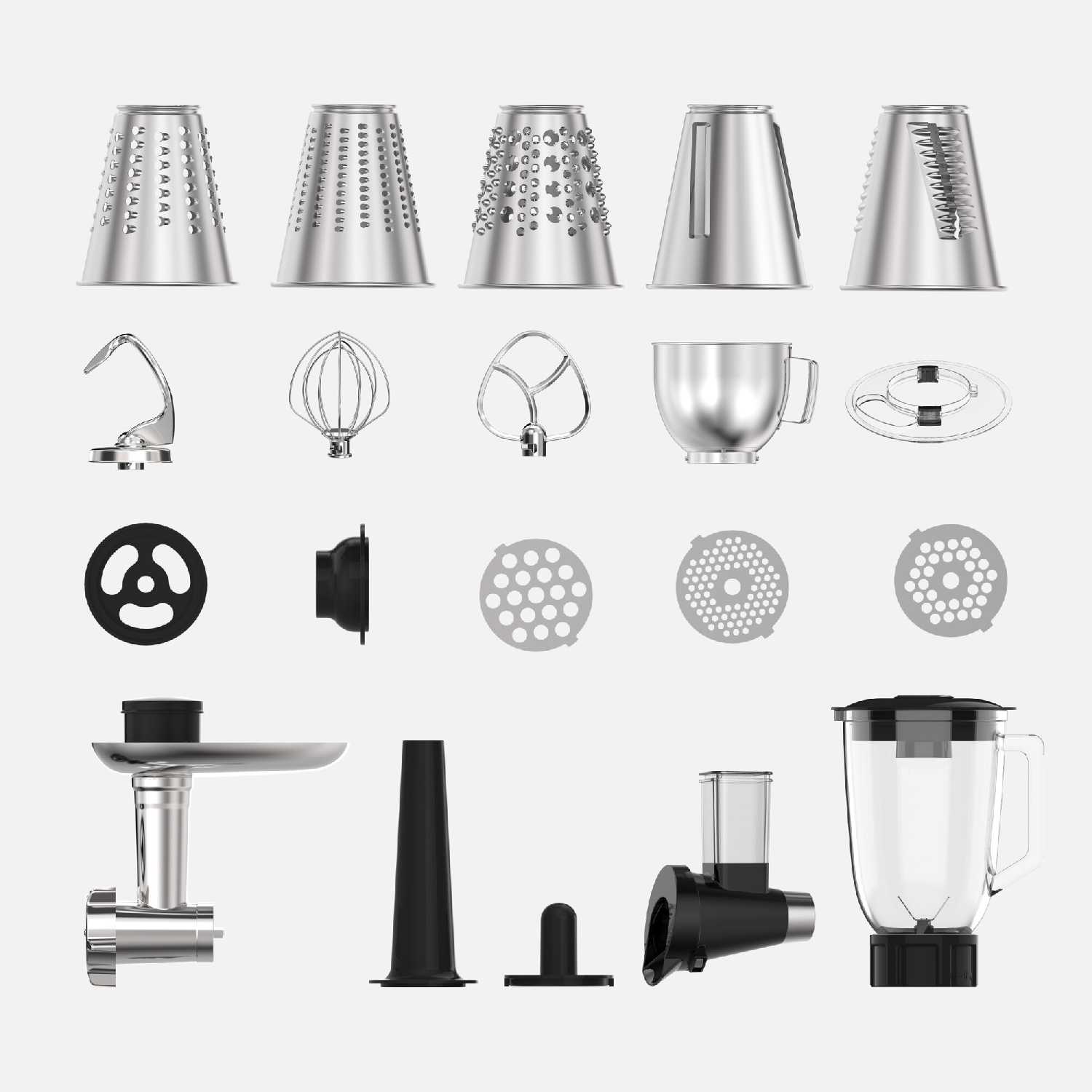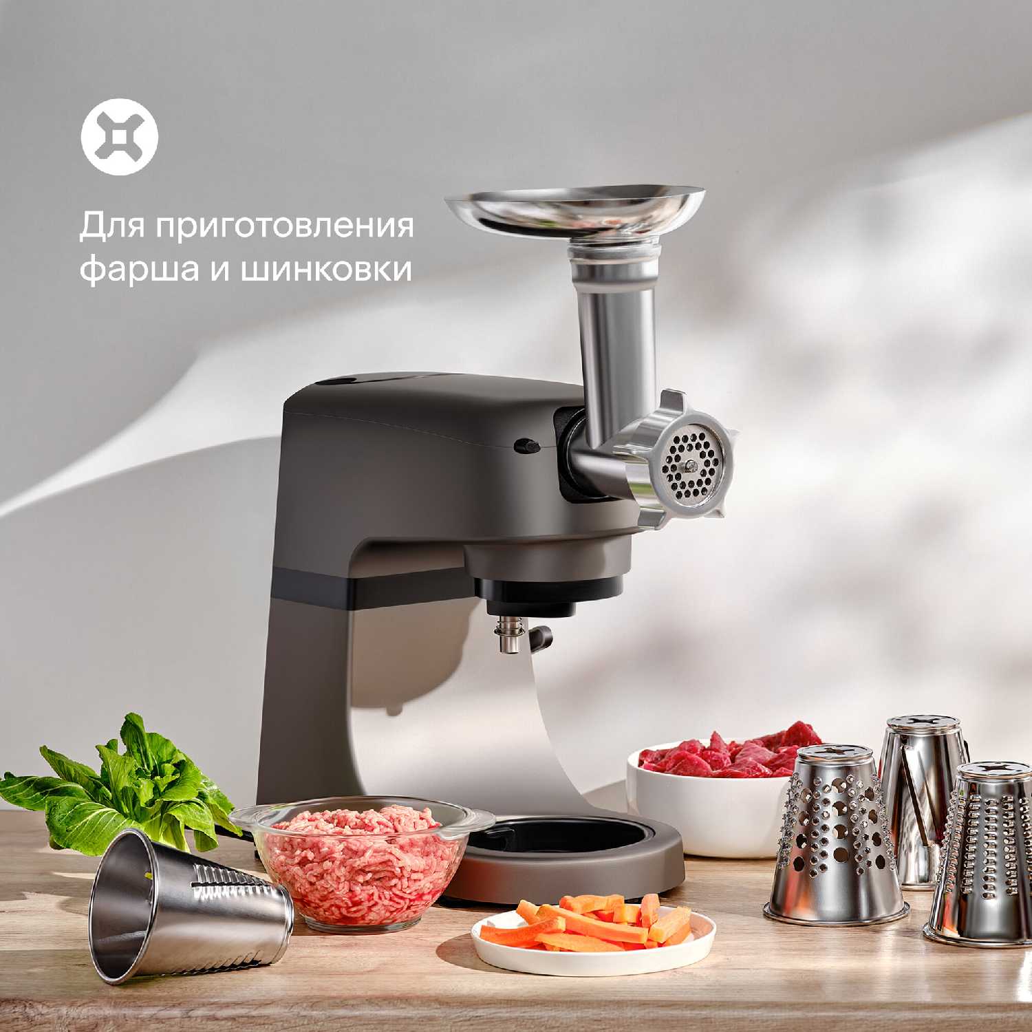 Мясорубка отлично справляется с мясом, фарш получается однородным. Миксер мощный, тесто замешивает быстро и без проблем. Блендер хорошо измельчает фрукты и овощи, а измельчитель помогает быстро нарезать орехи и зелень.
