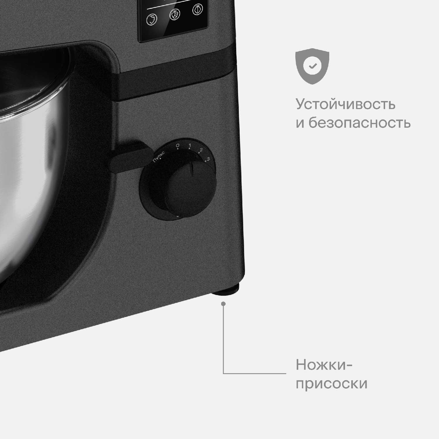 Комбайн оснащен присосками на ножках, которые, по отзывам, хорошо фиксируют его на столе, предотвращая вибрацию и движение во время работы. Это важная особенность для безопасного и комфортного использования, особенно на высоких скоростях. Устройство обладает солидным весом, что также способствует его устойчивости. -