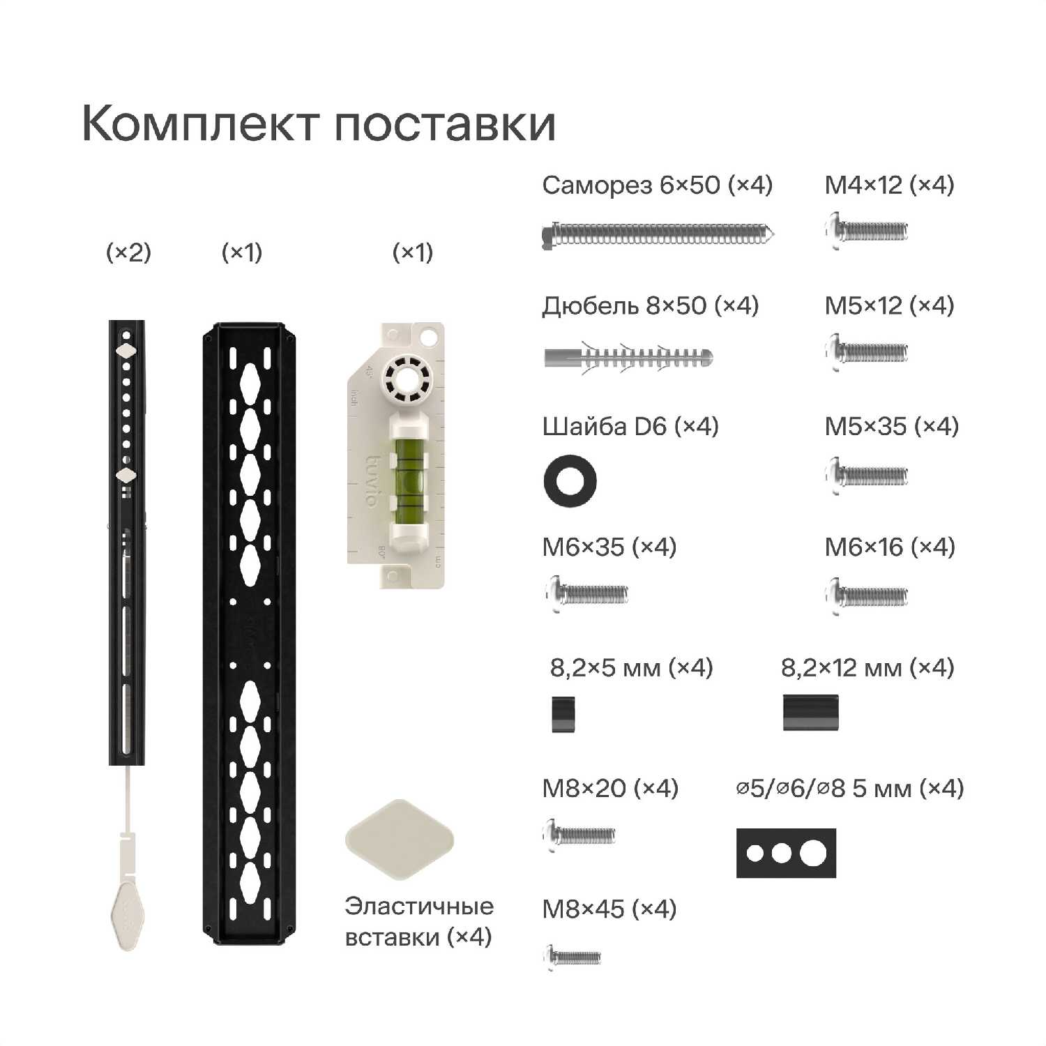 комплект удобный-все есть. тувио молодцы - все продумали. - - резинка-уплотнение между крепежной шиной и корпусом тв не держится в нижнем проёме-просто вылетает, в верхних отверстиях сидит как влитая. видимо кто инструкцию писал, в руках изделие не держали.