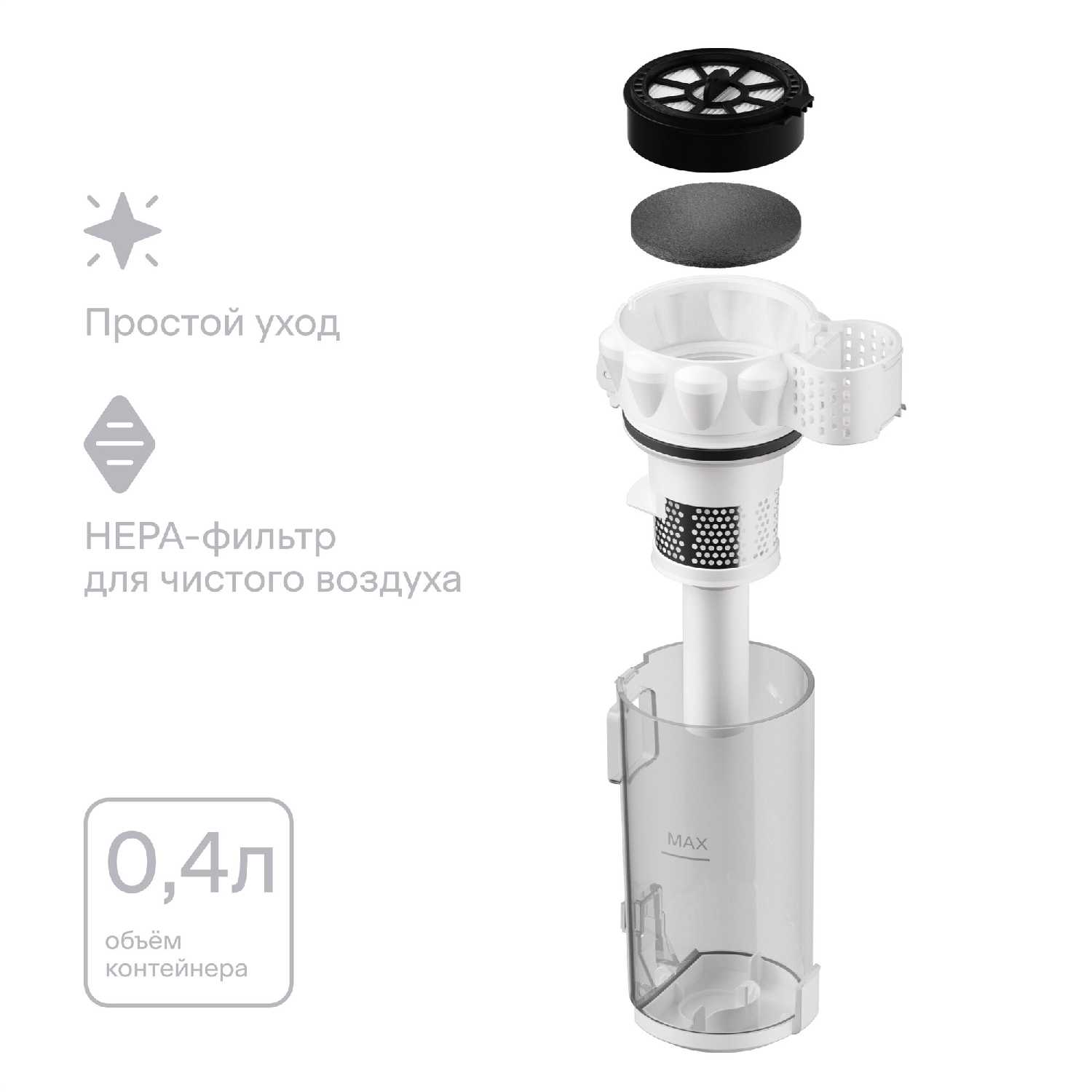 - Съёмный пылесборник объёмом 0.3 л легко очищается за секунды.