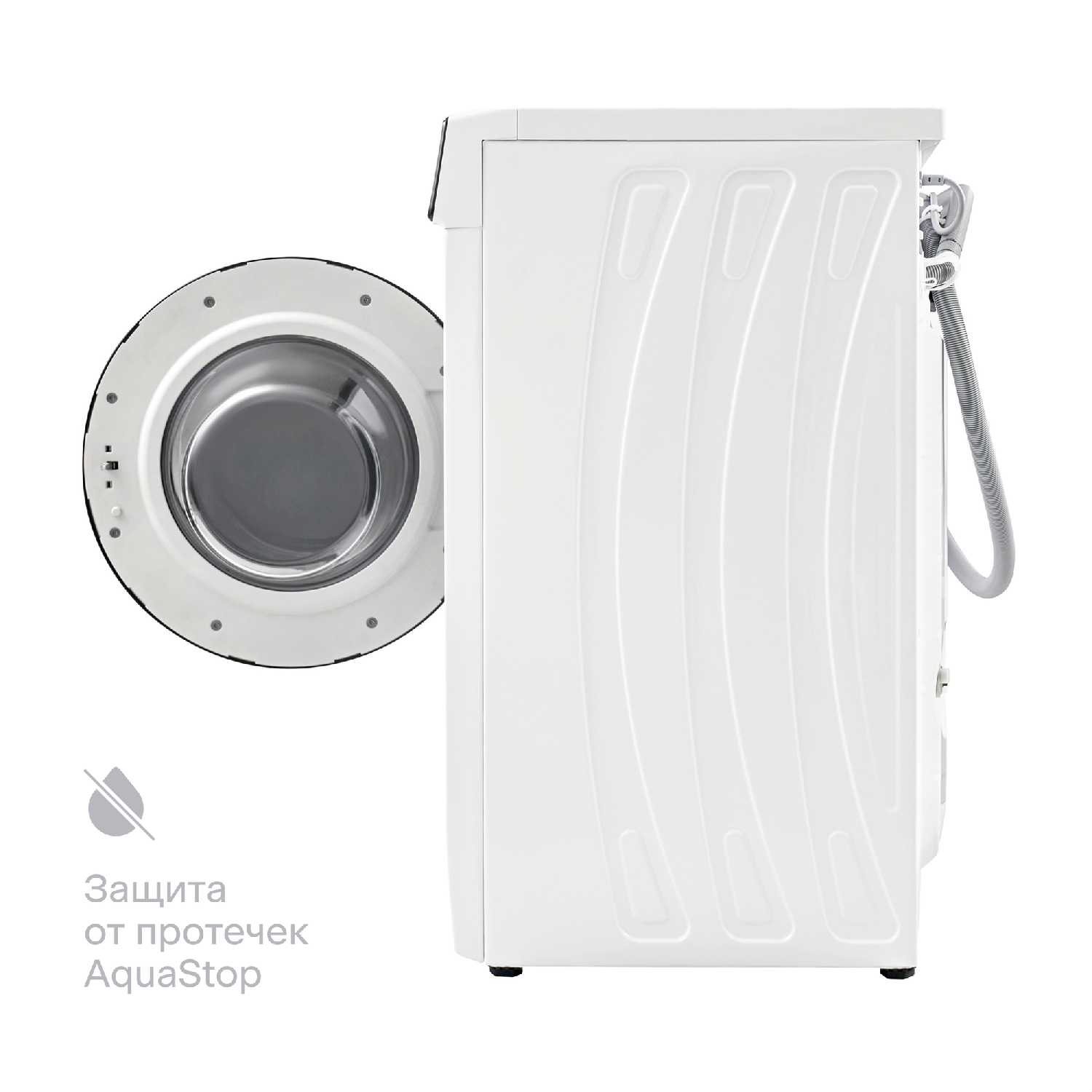 - Система AquaStop предотвращает протечки на заливном шланге.