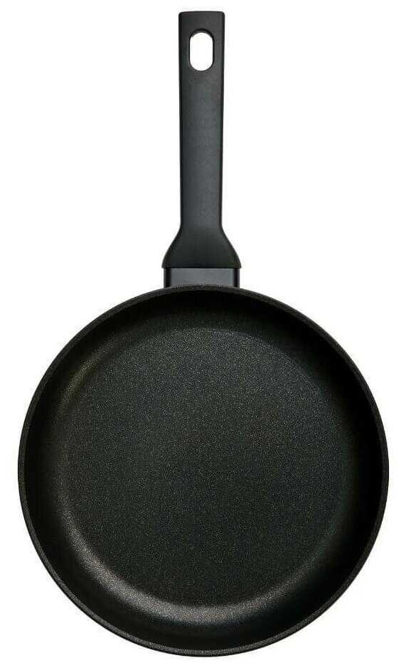 - + Отличное антипригарное покрытие, готовить приятно. Можно мыть в посудомоечной машине. Малое сужение к основанию сковороды = больше помещается продуктов. Красивая. :)