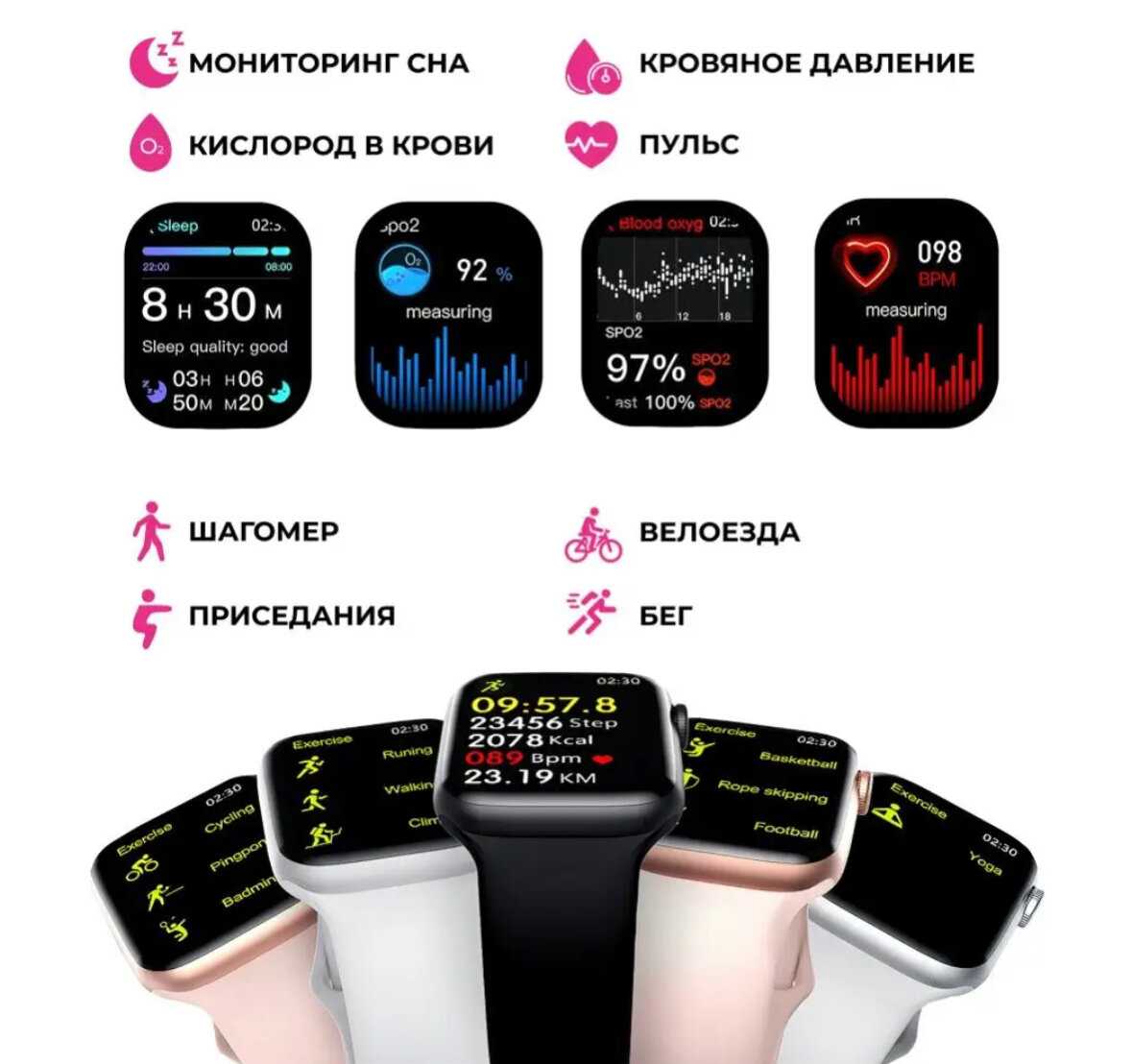 Мониторинг : | ЭКГ, пульса, сна, температуры тела, термометр, тонометр, уровня кислорода в крови, физической активности |