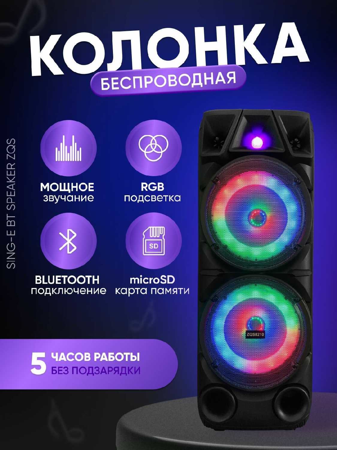 Отзывы о Беспроводная акустическая система ZQS 8210 - Колонка с подсветкой 40Вт, 2 динамика, FM радио, USB, AUX, micro SD, 4500мАч, черная