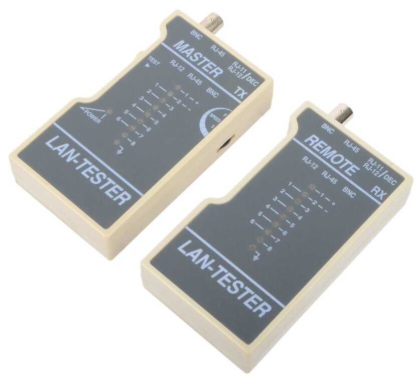 Хороший инструмент для проверки обжима проводов. Легко определить обрыв провода, "перепутанные" контакты. Обратите внимание, что тестер поставляется без батарейки.